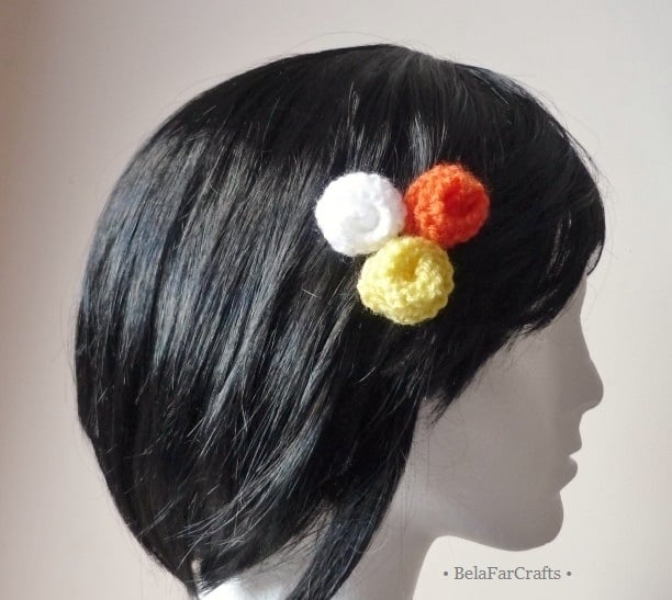 The hand knitted roses measure about 2.5cm (1in) wide and the attached grips are a bit over 4cm (1.5in) long. The hair grips can be removed should you wish to attach your own.