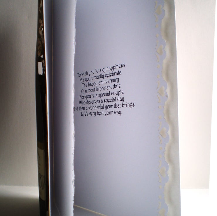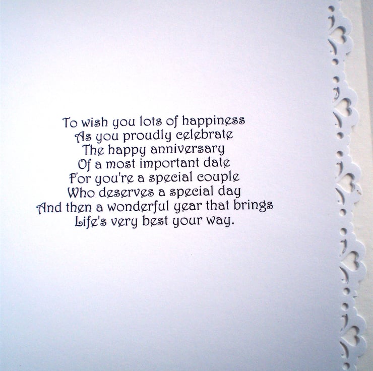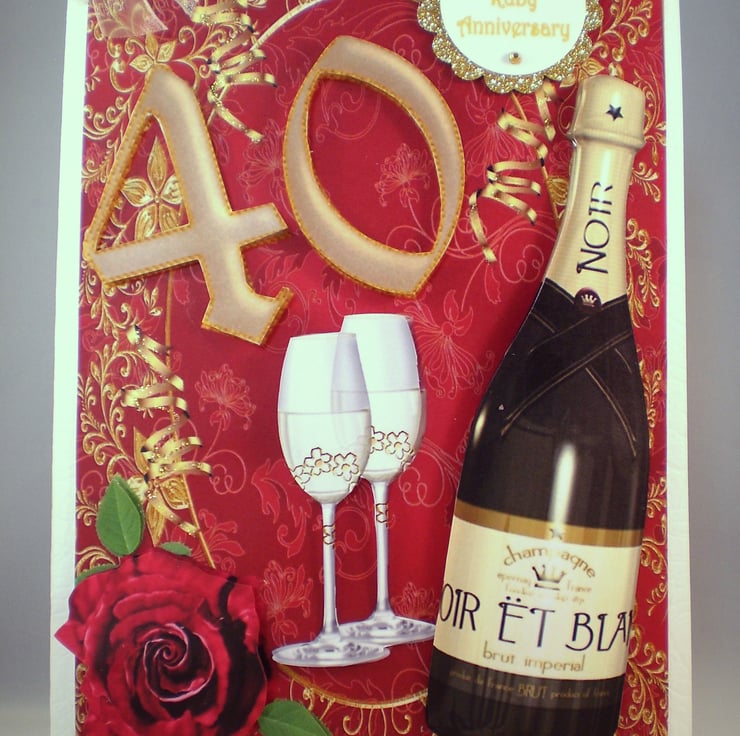 A Ruby Anniversary card measuring 150x210mm (6x8in). The design is 3D effect and the greeting is mounted on gold glittercard, I have added gold gems and a chiffon bow. Insert is white with a heart punched border and there is a verse