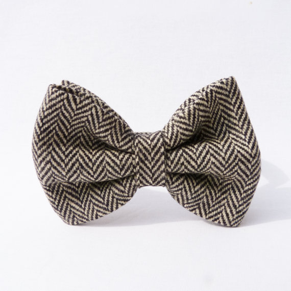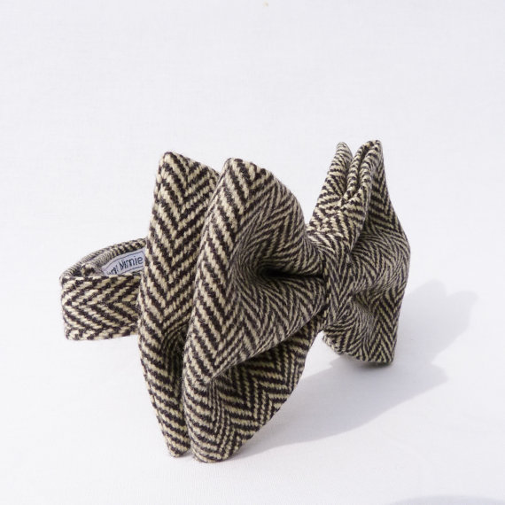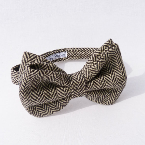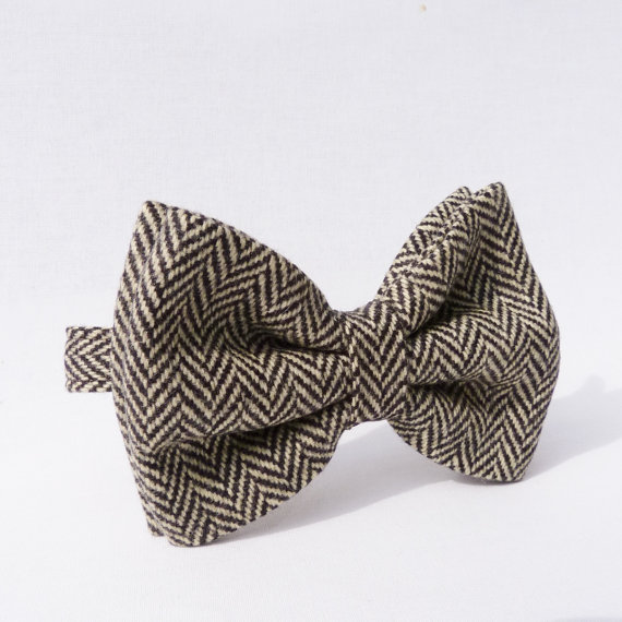 Bow ties are cool, fact. A super awesome mens accessory handmade from the finest black Irish herringbone tweed. Unlike most pretied bows this tie features a double bow and gives a true impression of a one piece bow tie. A simple velcro fastening makes it incredibly easy to fit and wear. The bow is oversized and larger than the average bow tie - measures approx 3.5" high x 5" wide. How retro!