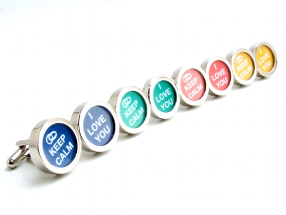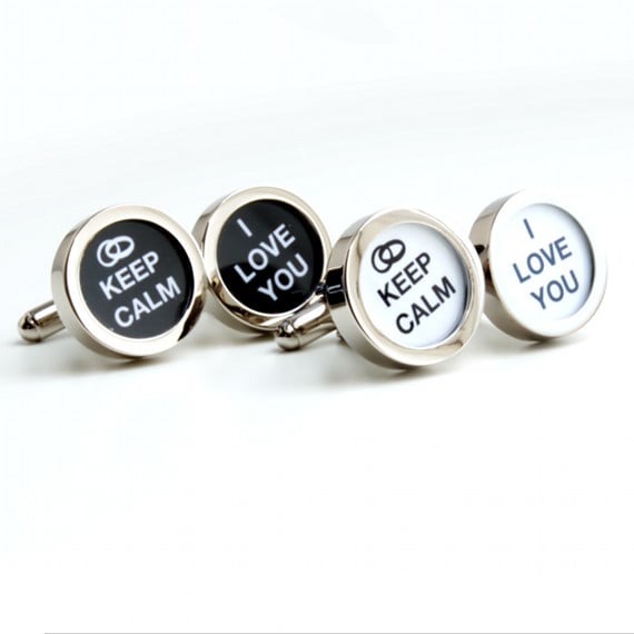 Wedding cufflinks for the Groom with Keep Calm on one cufflink and I Love You on the other with a pair of wedding bands over Keep. These are pictured above in a range of colour options or can be custom made in your own choice of colour.