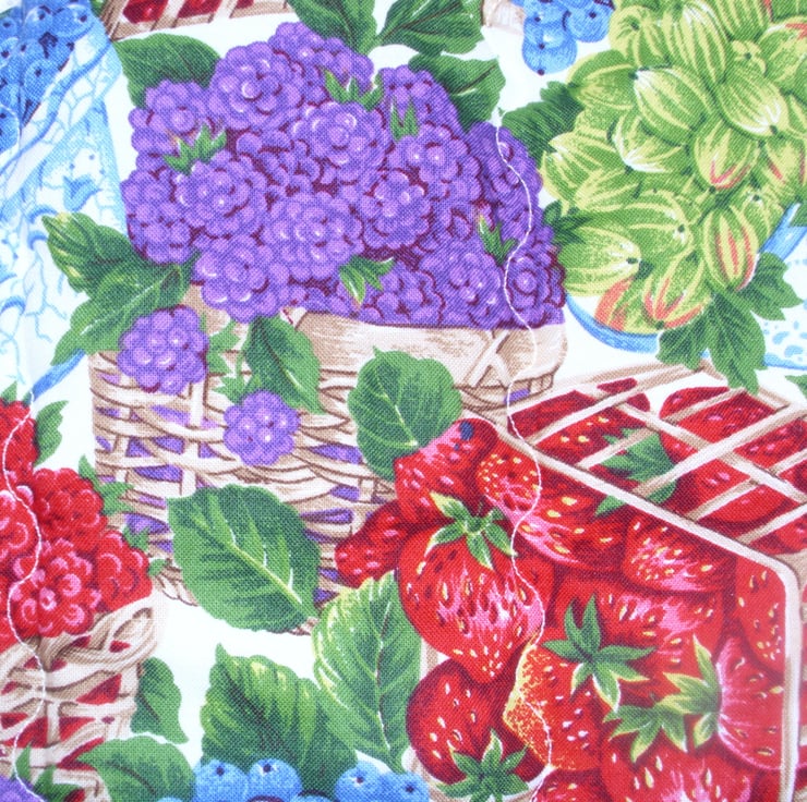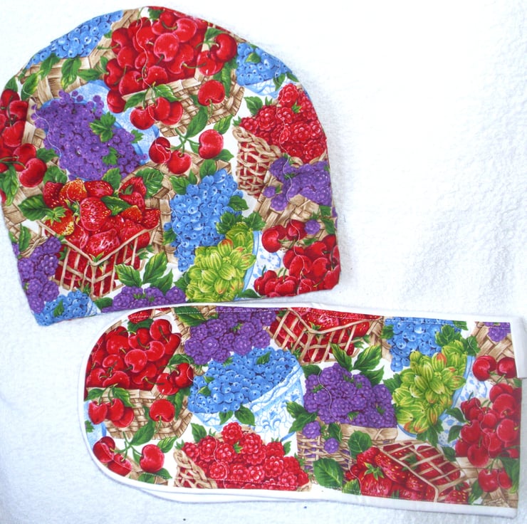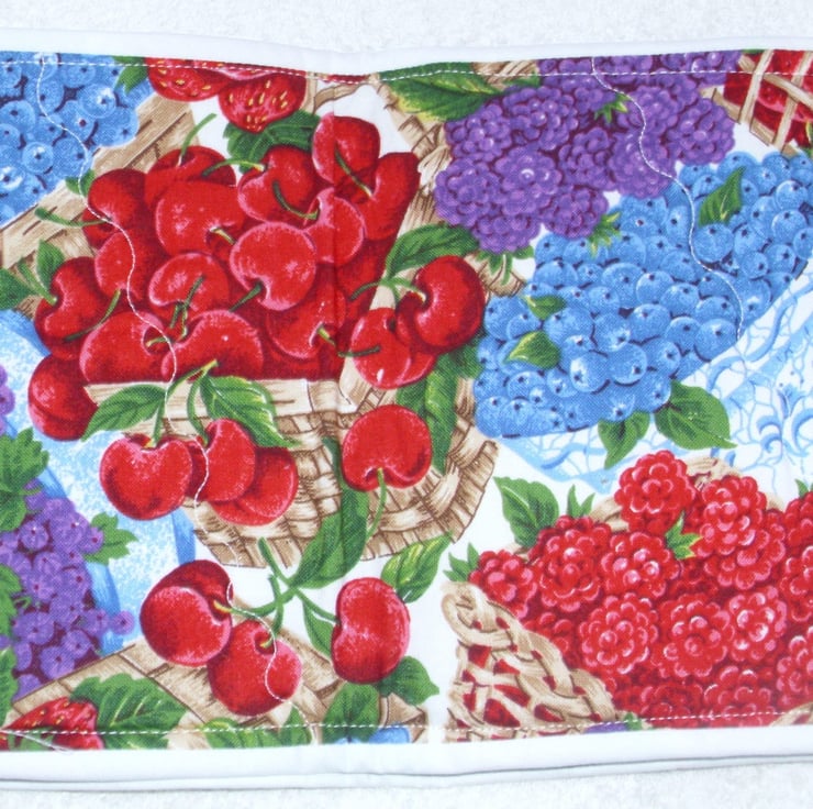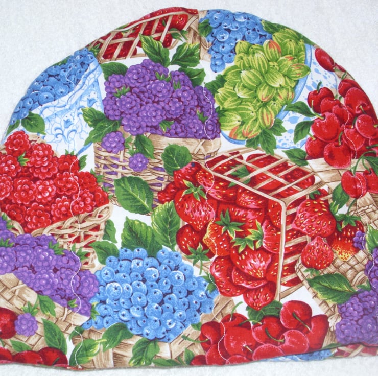 baskets of cherries, raspberries, strawberries, blackberries and gooseberries, bright and colourful, fruit looks good enough to eat.nice items to use and have on display. Tea cosy measures 25 cms high x 27 cms wide
