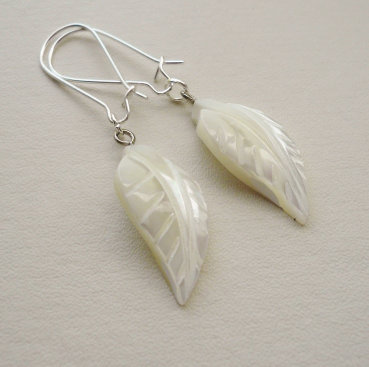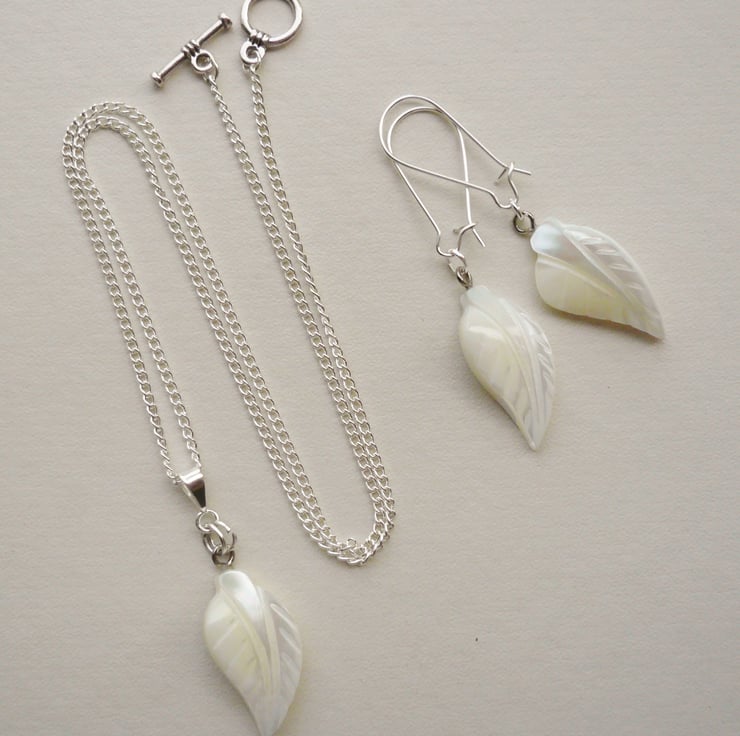 The earrings are made up of the same mother of pearl leaves and are attached to silver plated ear hooks. Length incl hooks is approx 5cm.