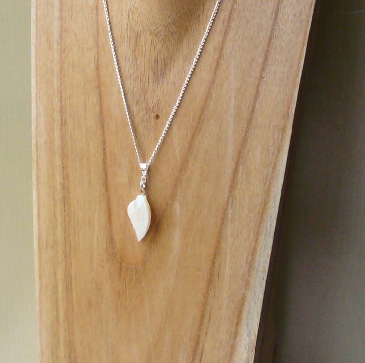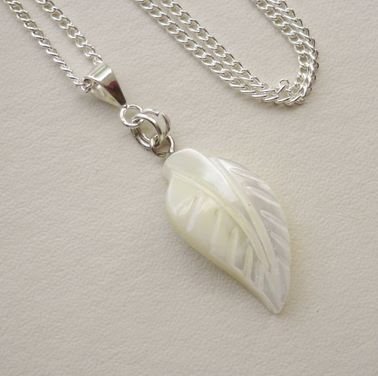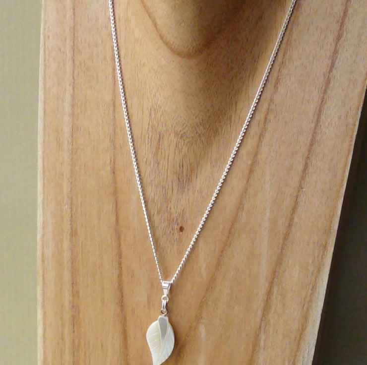 The necklace consists of a 25mm long mother of pearl leaf attached by a silver plated pendant bail to a 45cm/18" long silver plated chain with toggle clasp. Length of drop from chain incl bail is approx 4cm.