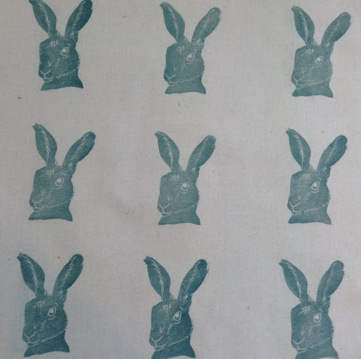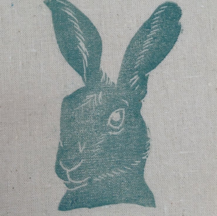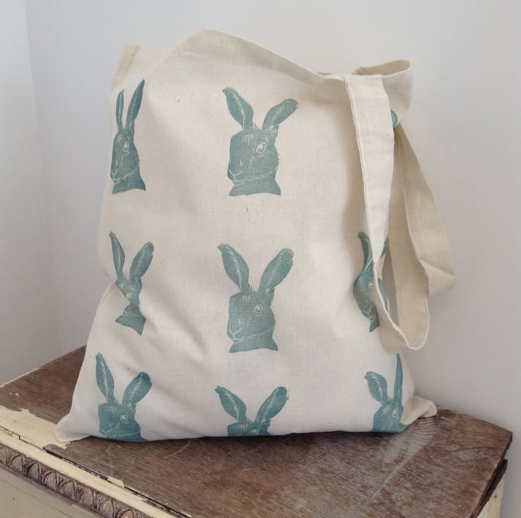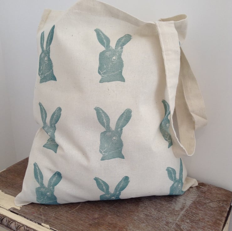 A beautiful cotton summer bag, hand printed with linseed oil based ink hares in grey blue.