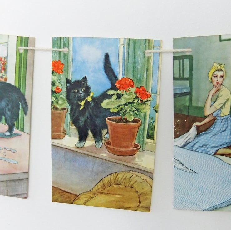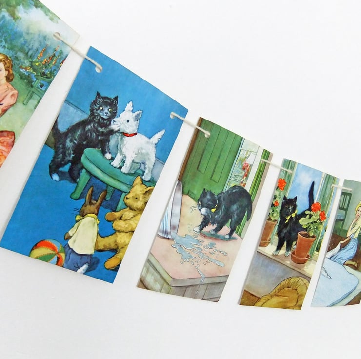 This lovely bunting has been made from a rescued vintage Ladybird Book, ' Tiptoes the Mischievous Kitten', first published in 1949. This garland would be gorgeous for a child's nursery, bedroom or playroom and lovely for a children's party.