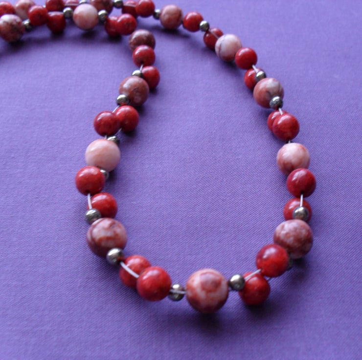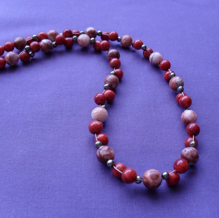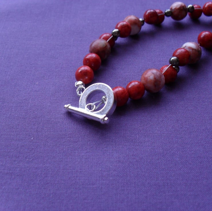 Fancy blood stone approx. 10 mm, sponge coral 8 mm and pyrite are beaded with beading thread with a silver plated toggle clasp.