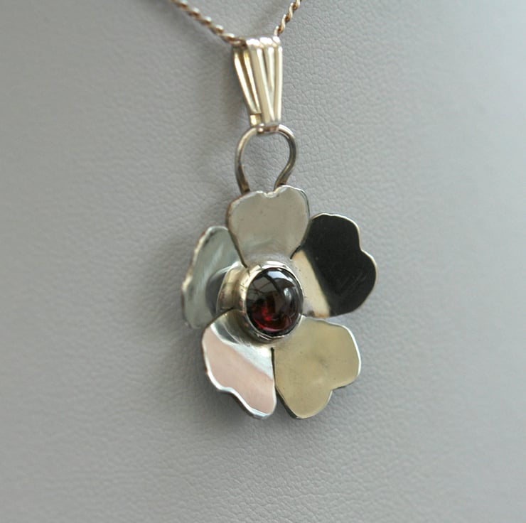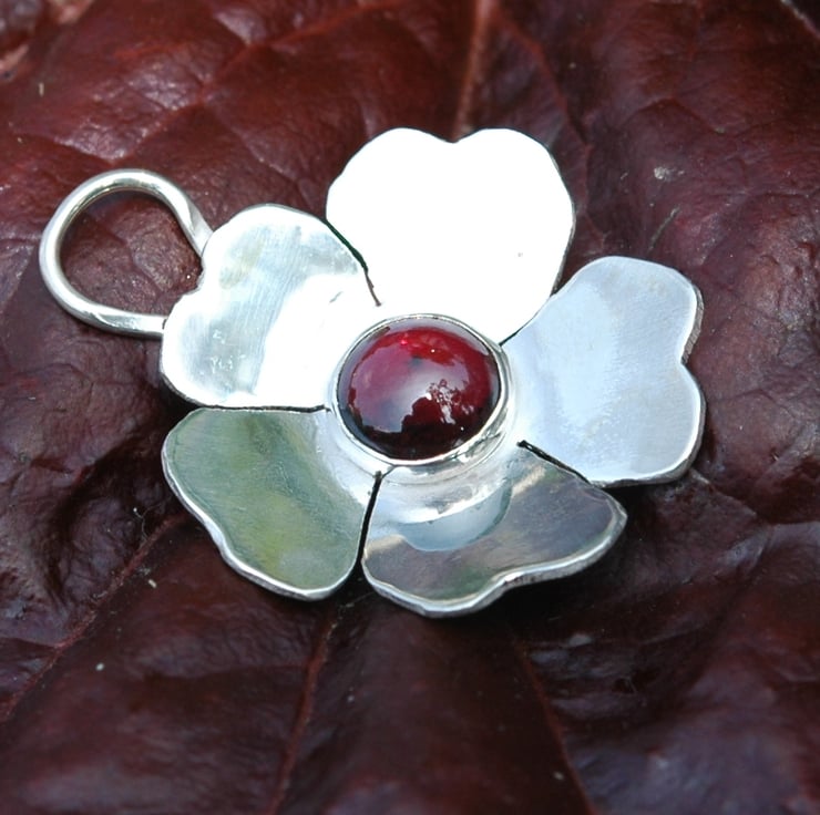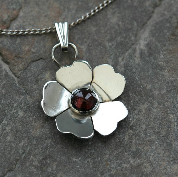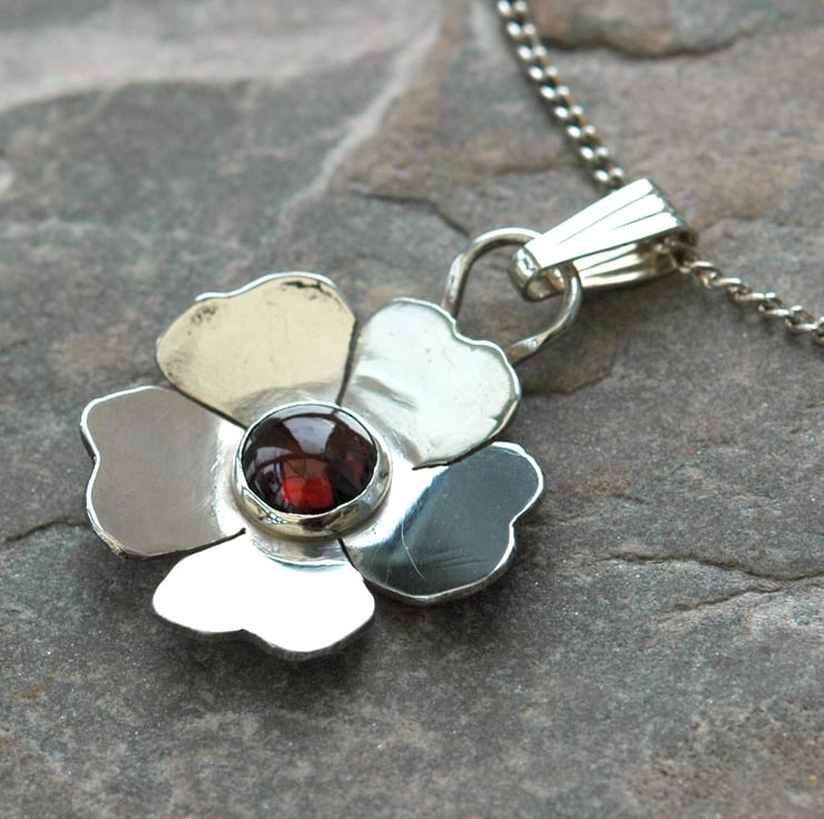 This lovely pendant features a sterling silver setting in the shape of a wild rose flower with five petals. Garnet is the birthstone for January and the pendant would also make an ideal gift for Valentine's Day or Mother's Day. A doming punch has been used to form it into a cupped shape with an 8mm cabochon of deep red semi-precious garnet at its centre. There is an integral sterling silver loop for attaching the chain. The pendant will be supplied with a 16inch (40cm) silver trace chain and a silver bail.