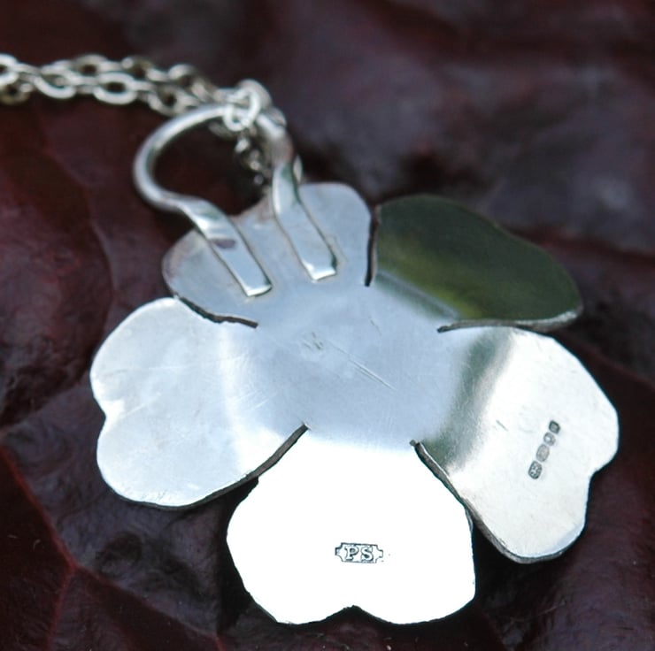 The flower measures 3cm in length, including the loop, and 2.5cm in diameter. Its mass is 4.7g. Traditional silver hallmarks including my own maker's mark have been applied to the reverse side by the London Assay Office.