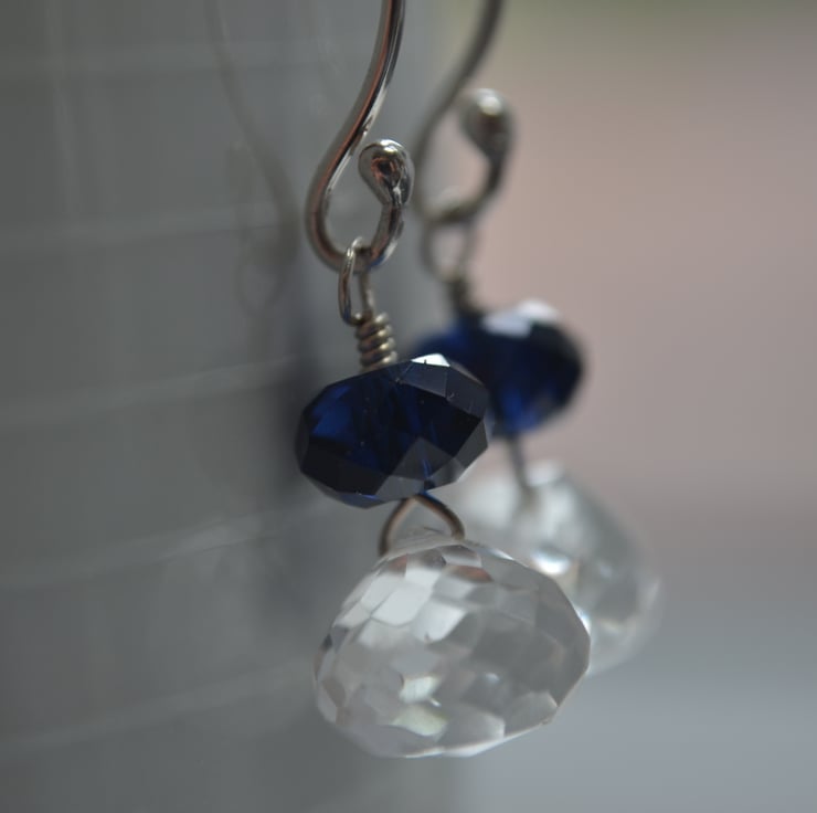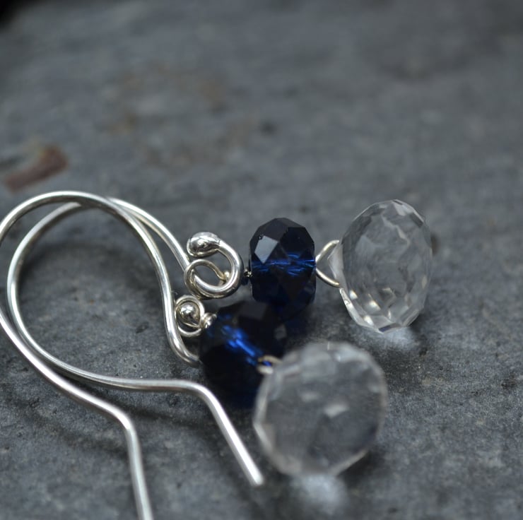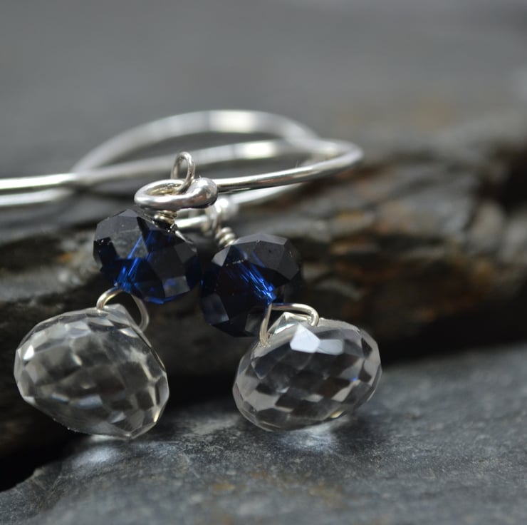 These earrings combine deep blue swarovski rondelles, with beautiful shimmery crystal quartz briolettes.