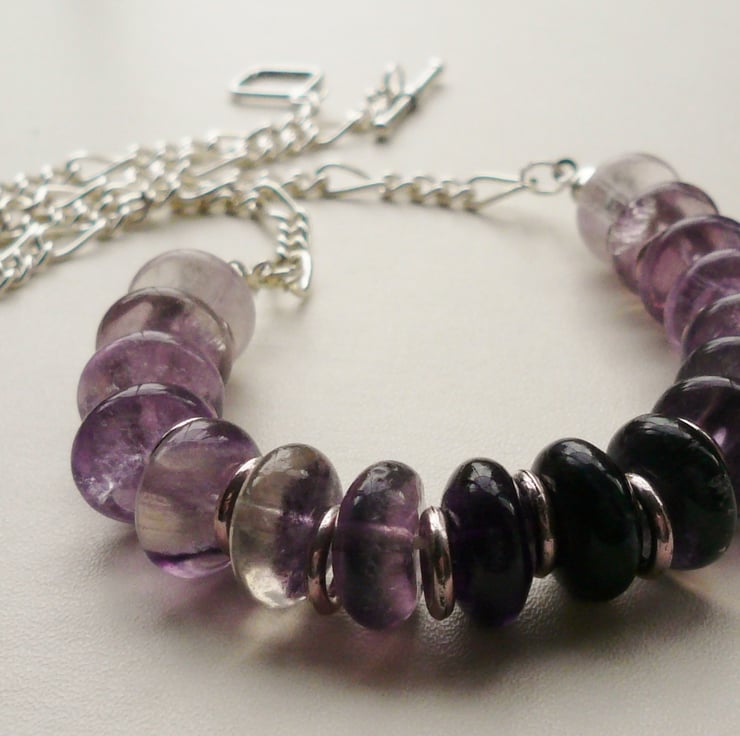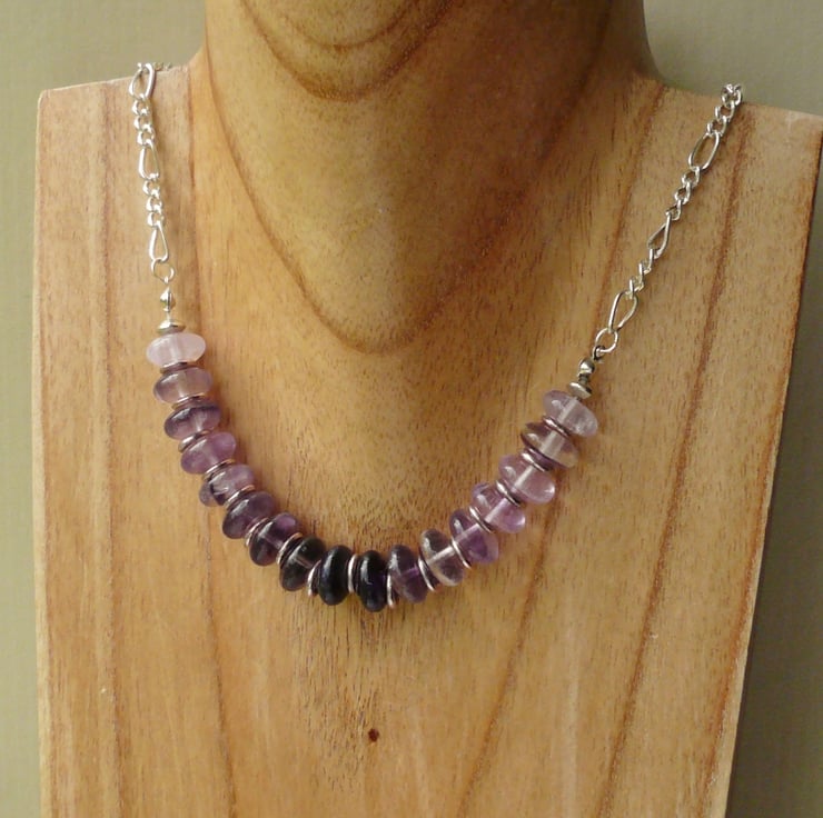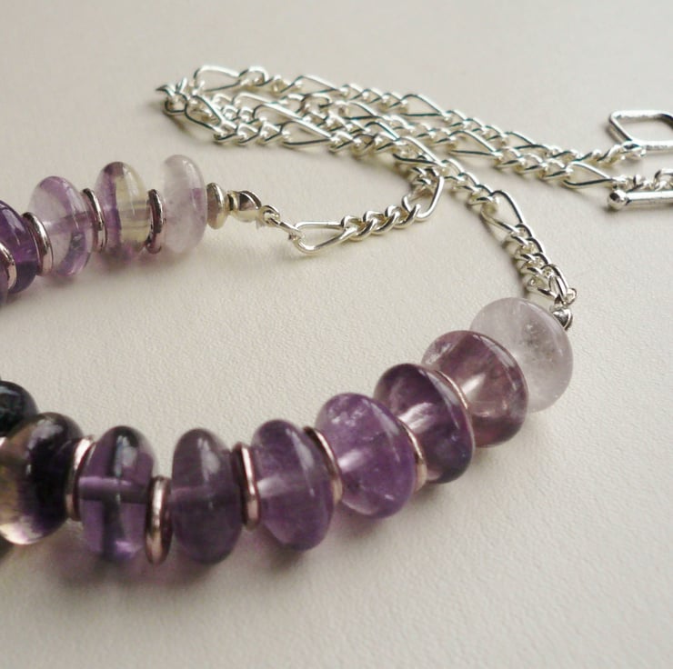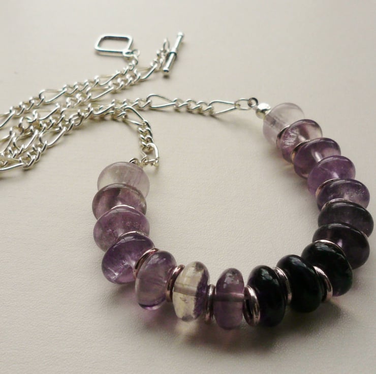 This necklace is simply made up of 10mm semi-precious amethyst rondelle beads with Tibetan silver plated ring spacers inbetween. Finished off with a silver plated chain and toggle clasp. Total length incl clasp is approx 50cm.
