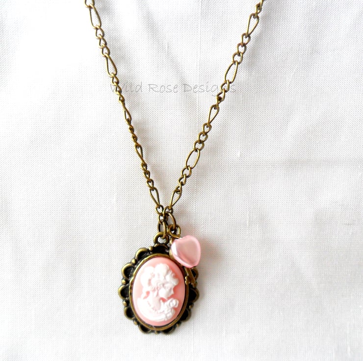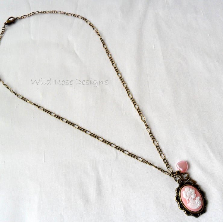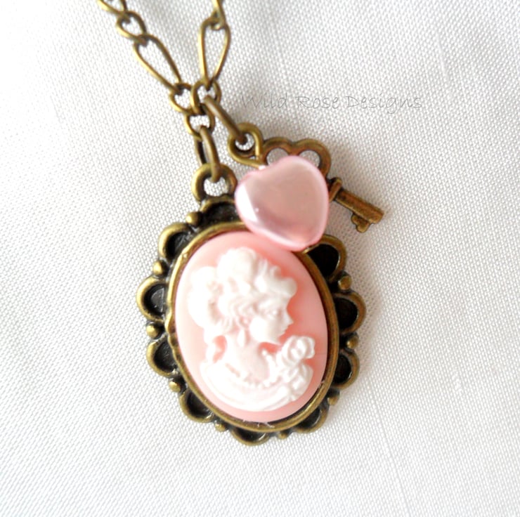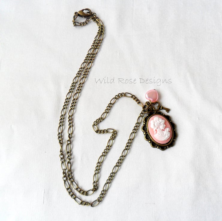 Pretty vintage style handmade pendant with a pink and white cameo, small pink heart bead and bronze key charm. The cameo is set on an antique bronze Figaro chain that measures 47 cm (18 1/2") including the lobster claw clasp.