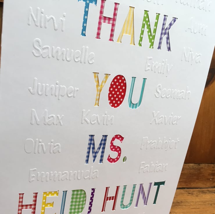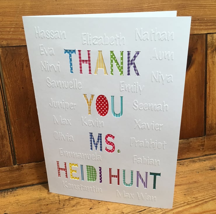 This very personal Thank you card for a class teacher features a hand cut thank you message to the teacher with the name of every child embossed around it. The card is A4 in size making it big enough for lots to sign!