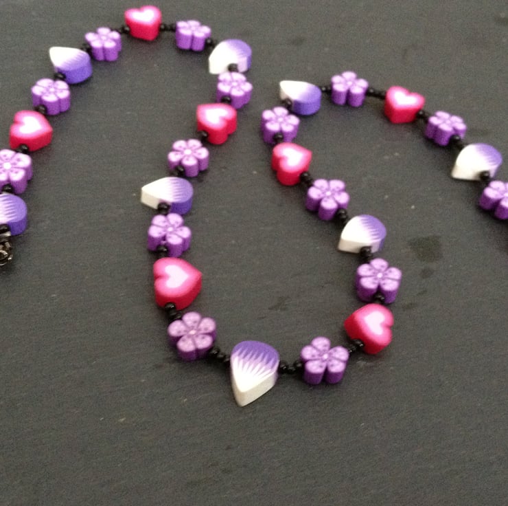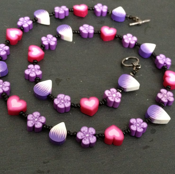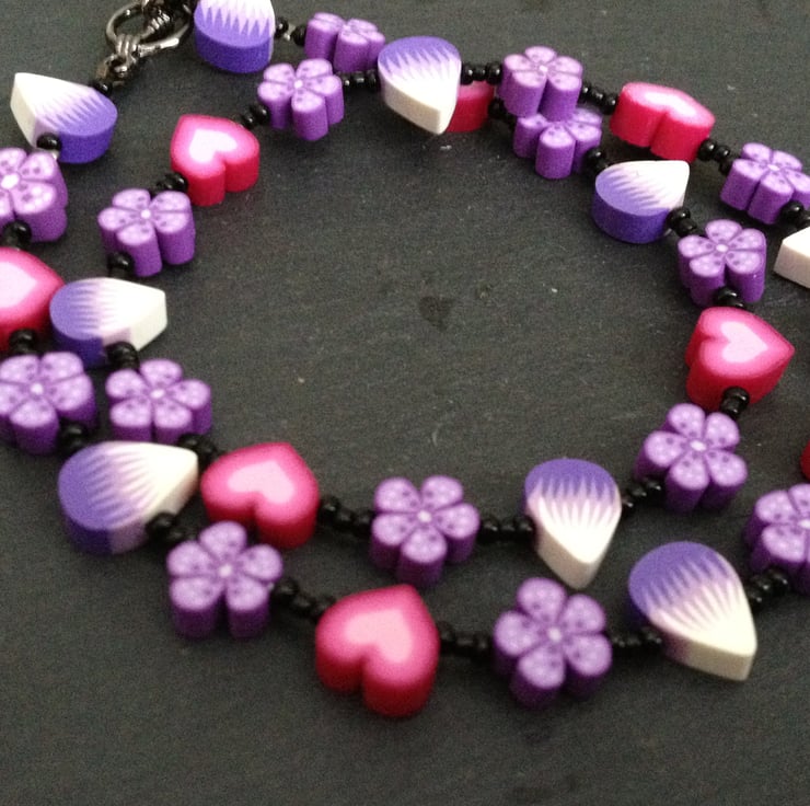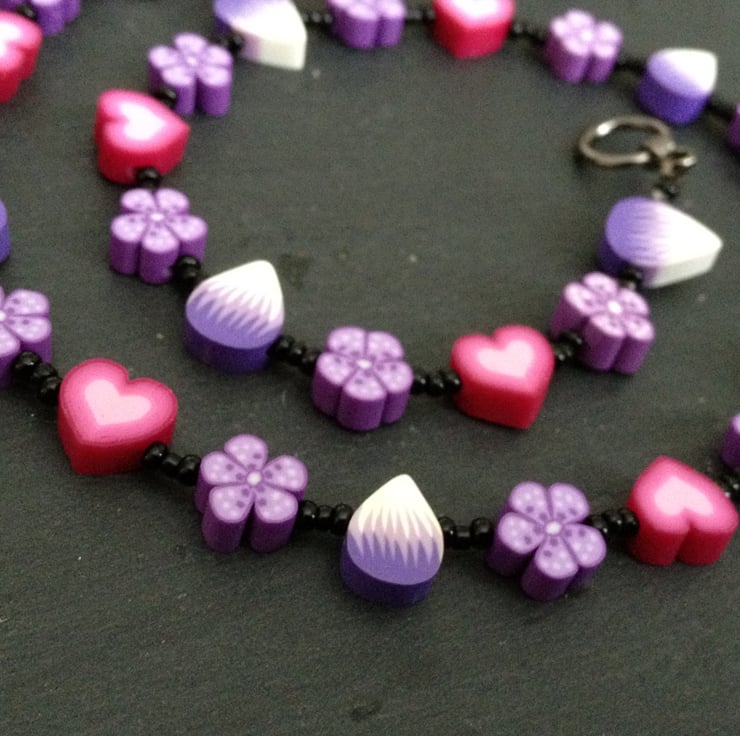 Part of the Sugar and Spice Collection, this sweet design featuring a variety of polymer clay canes ranging from petals, flowers, and hearts in shades of candy pink and lavender is off-set to dramatic effect with the simplest black seed beads and high quality black metal jewellery findings.