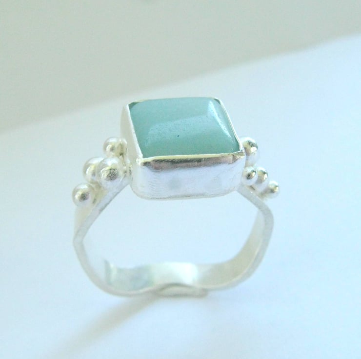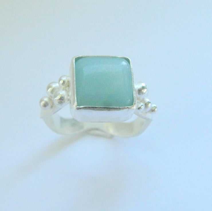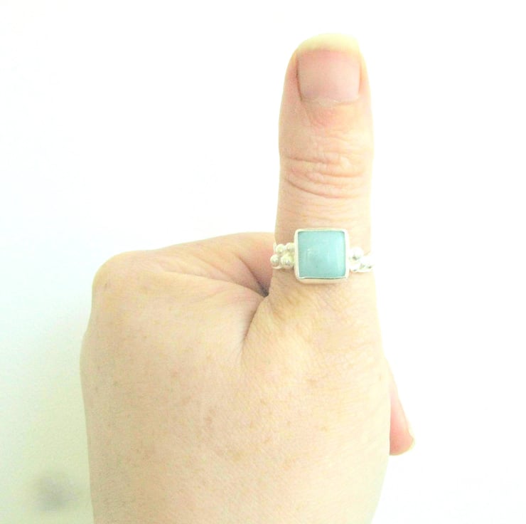 A wave design sterling silver band set with a beautiful amazonite stone. The ring pictured is sized at a S. If you would like this ring in a different size please just let me know via the contact the designer button on the right and I will make one to your specification.