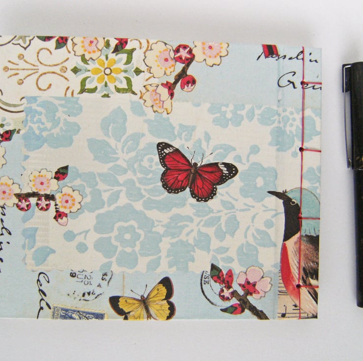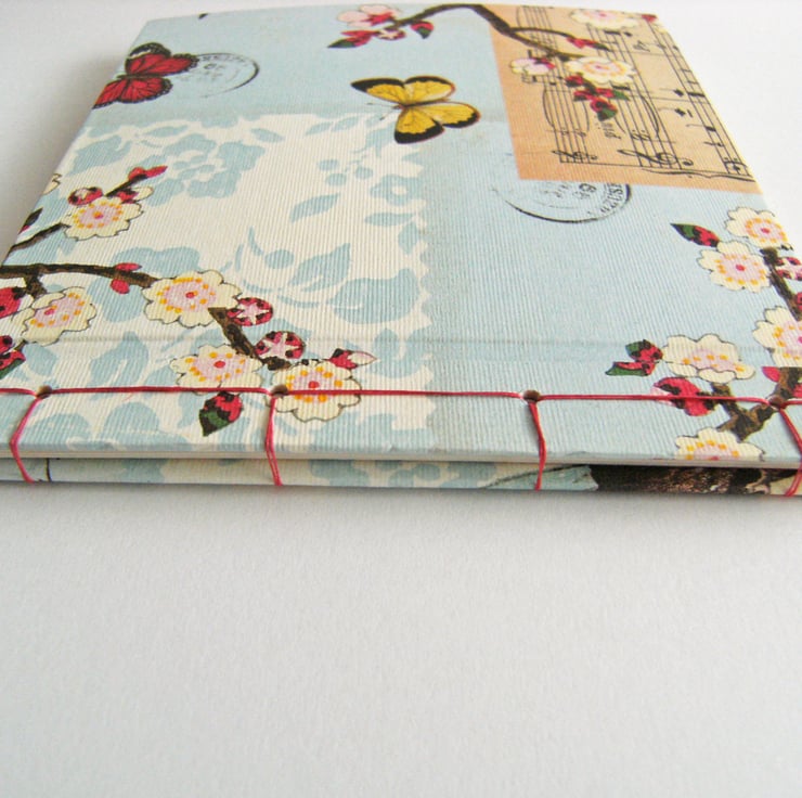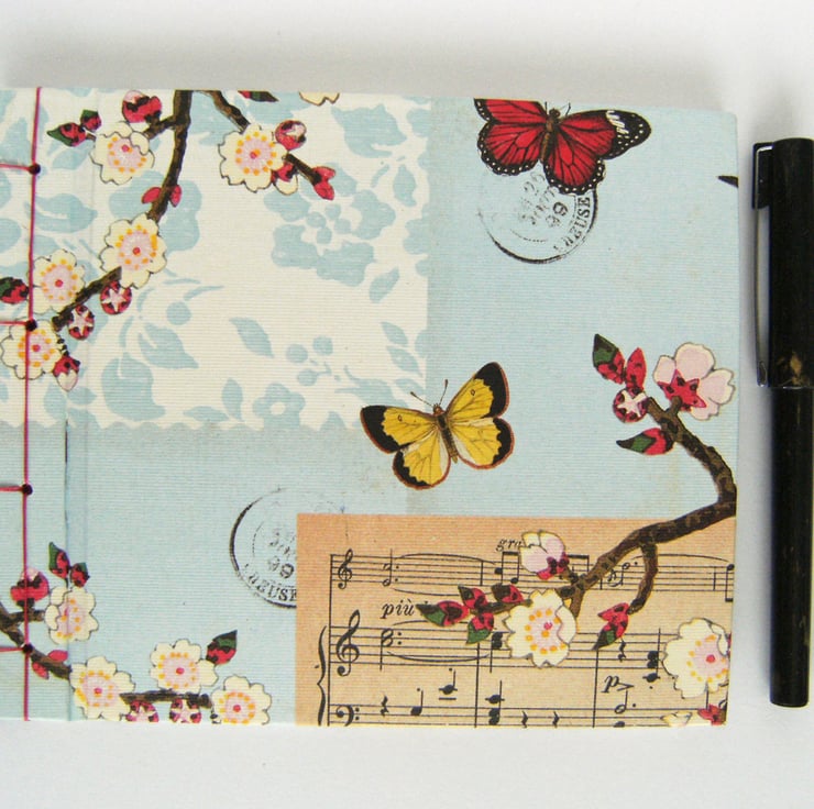 The covers are in high quality Italian paper, in a design of blossoms and butterflies, with a collage background. The cover linings are in strawberry red Murano art paper.
