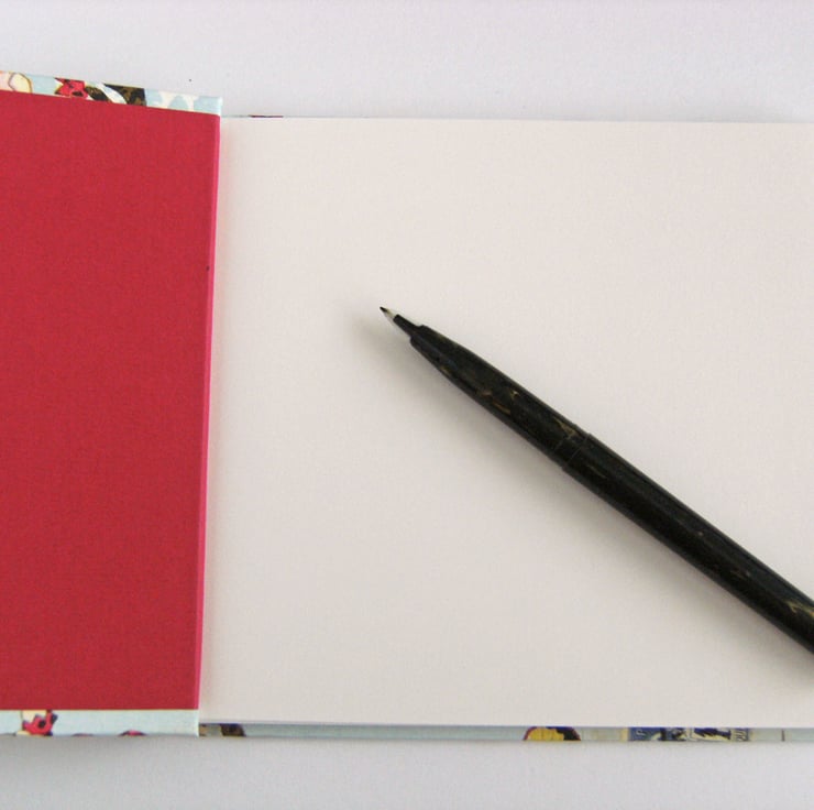The book is hand bound in strawberry red linen thread, with a Japanese style stab-stitch binding. The book has hinged covers, to allow them to fold back flat.