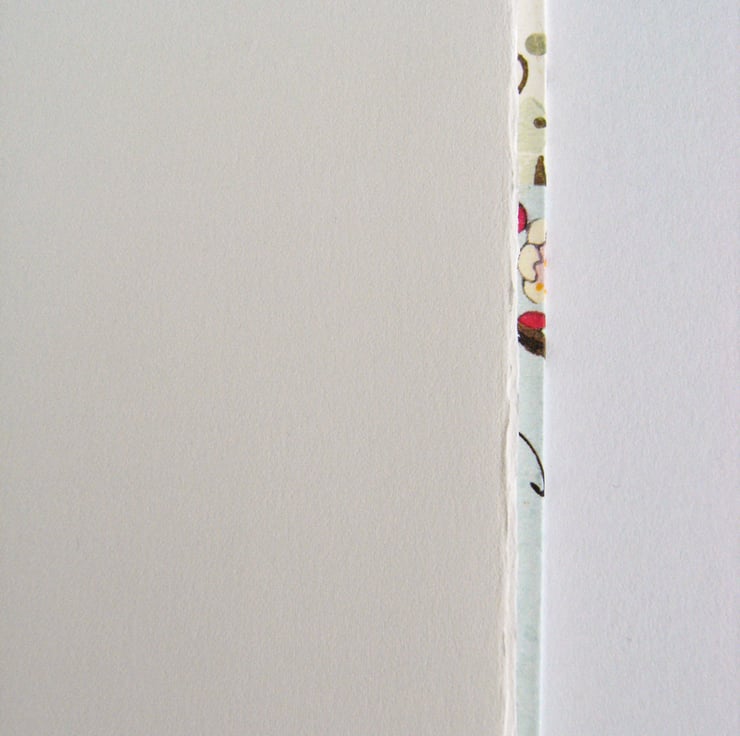 Inside, there are 16 pages of beautiful, stiff Fabriano artists' paper with a smooth finish. The pages have hand-torn edges to give a slight deckle finish; some still have the natural deckle at the front edge, formed when the sheets of paper were individually made in a frame.