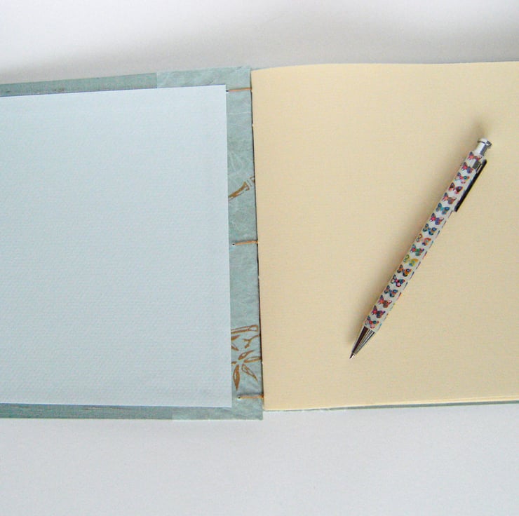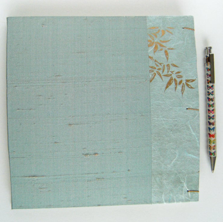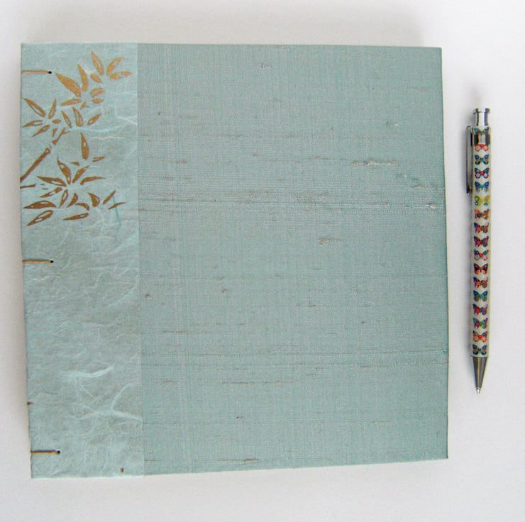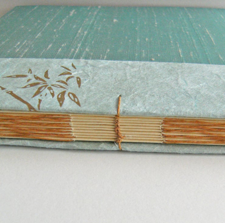 The edge of each cover is trimmed with a soft aqua mulberry paper, which has silk fibres in it and is printed with golden sprays of bamboo. The cover linings are soft aqua Canson art paper.