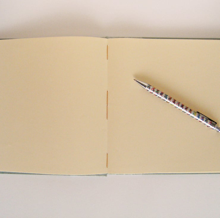 The book is hand bound in golden linen thread, with a hybrid Coptic / French Longstitch binding. The binding is made on the fold of each page section, allowing the book to open out flat all the way through.