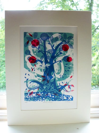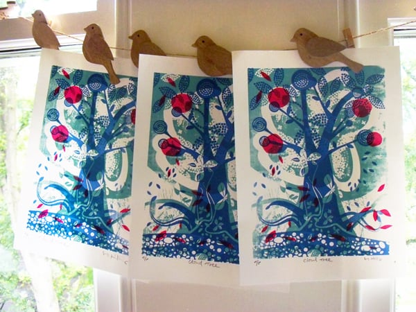 'Cloud Tree' is a three colour original hand pulled screen print designed and printed in my local printmaking studio. It's printed using vibrant red, blue and light blue ink. Each layer has been squeegee pulled using my muscles!