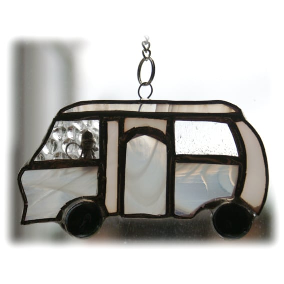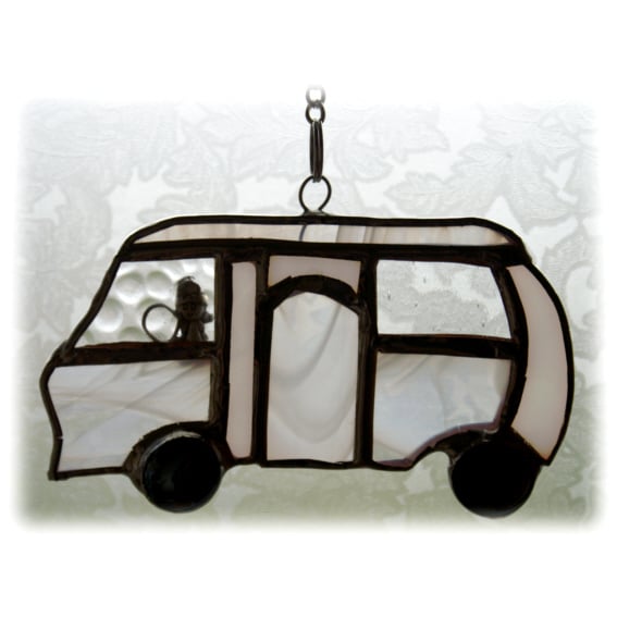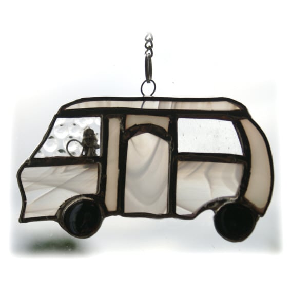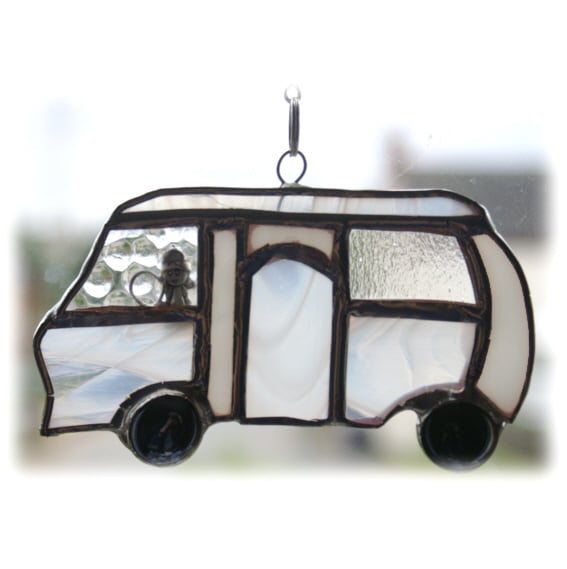 It is one of my special designs - a sweet little, classic shape, motorhome made of clear textured and white streaky glass all soldered together, polished and ready to hang in the window.