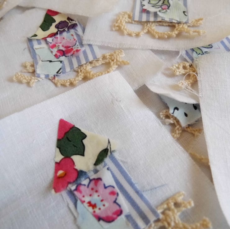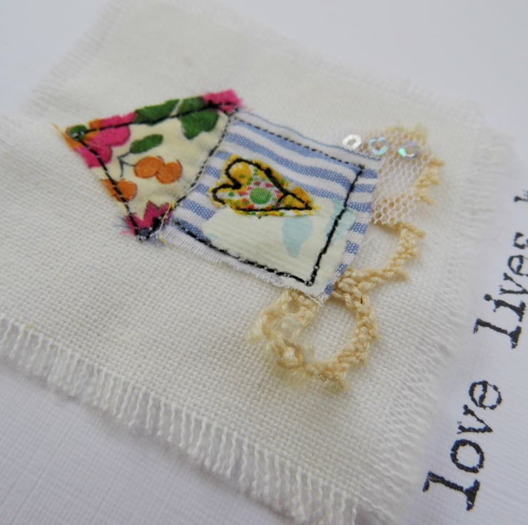 made from fabric and free machined onto fabric and placed onto a white card this is a lovely card to welcome you to your new home