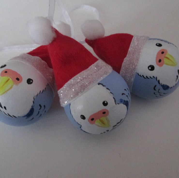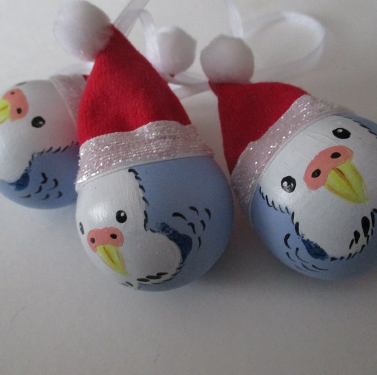 This is a set of three light blue hand painted budgerigar Christmas tree decorations. They are wooden baubles, and each is hand painted in acrylics to look like a budgie. Each wee bird has a home made mini Santa hat,