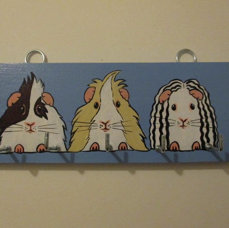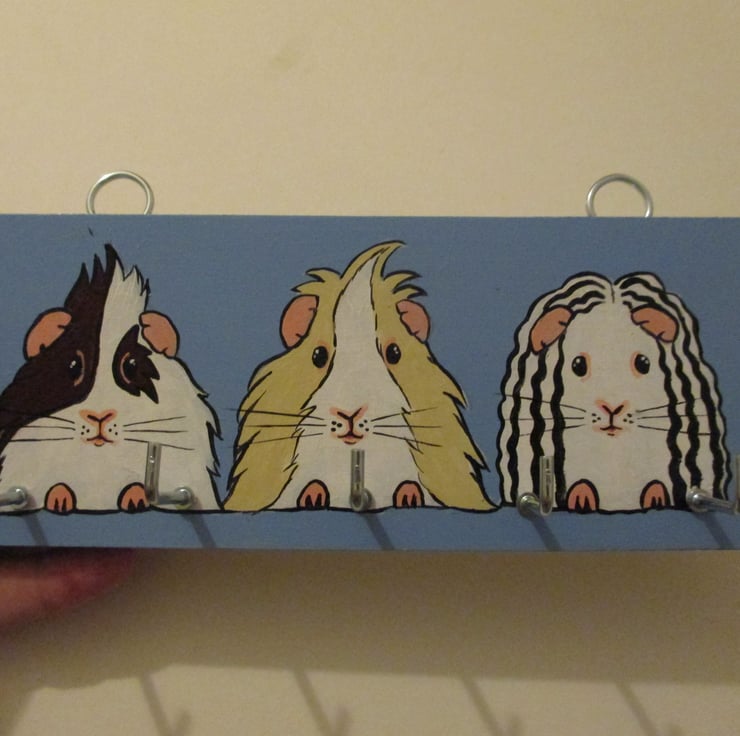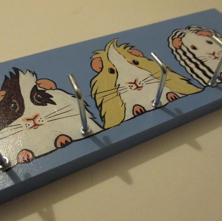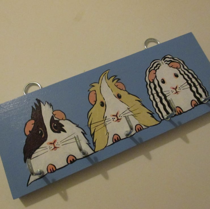 This is a hand painted key rack / holder featuring three cartoon style guinea pigs. It is an ideal gift for an animal lover, and is great to use for hanging your key, memory sticks, necklaces - anything you like!