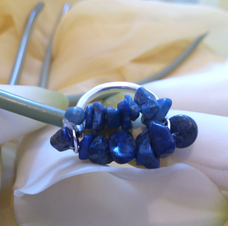 Handmade sterling silver ring with lapis lazuli chips on elastic to fit most people. Can be made to fit if size supplied. Comes with gift box. Stone colour may vary due to nature of crystals.