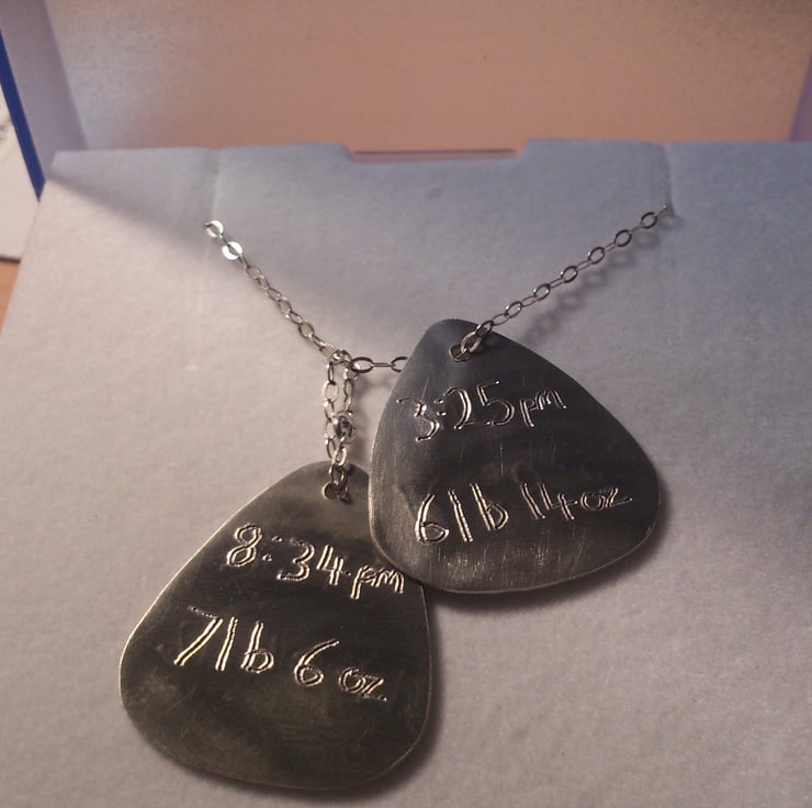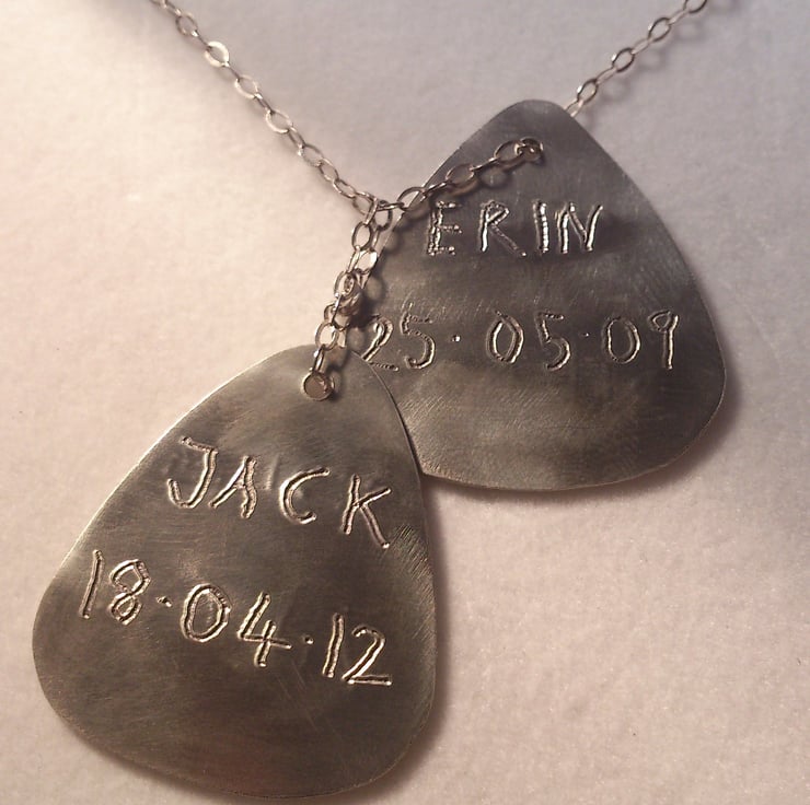 Handmade sterling silver dog tags in the shape of guitar plectrums. Can be personalised on request. Comes with chains at length of your choice. Presented in a gift box.