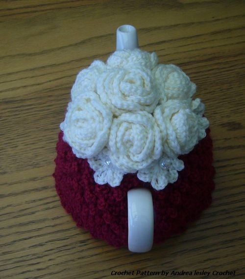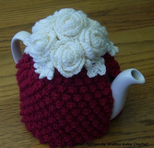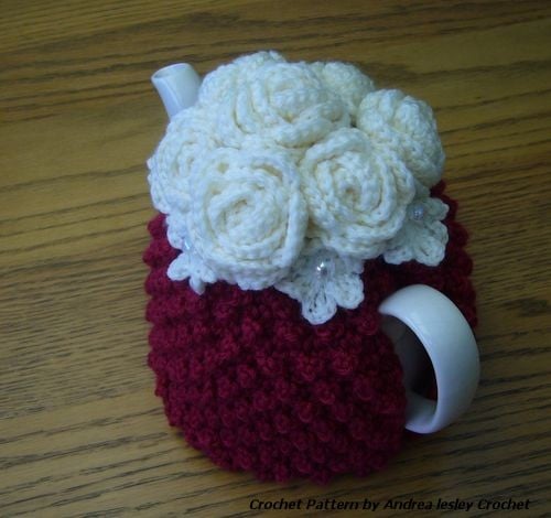 This crochet pattern is for a rose tea cosy which will fit a standard 4-6 cup size teapot including a 'Brown Betty'.