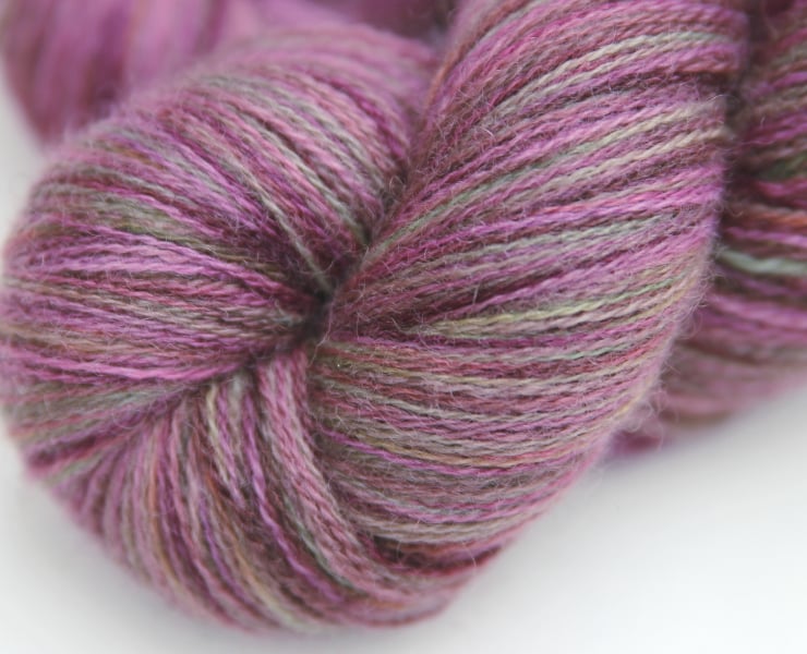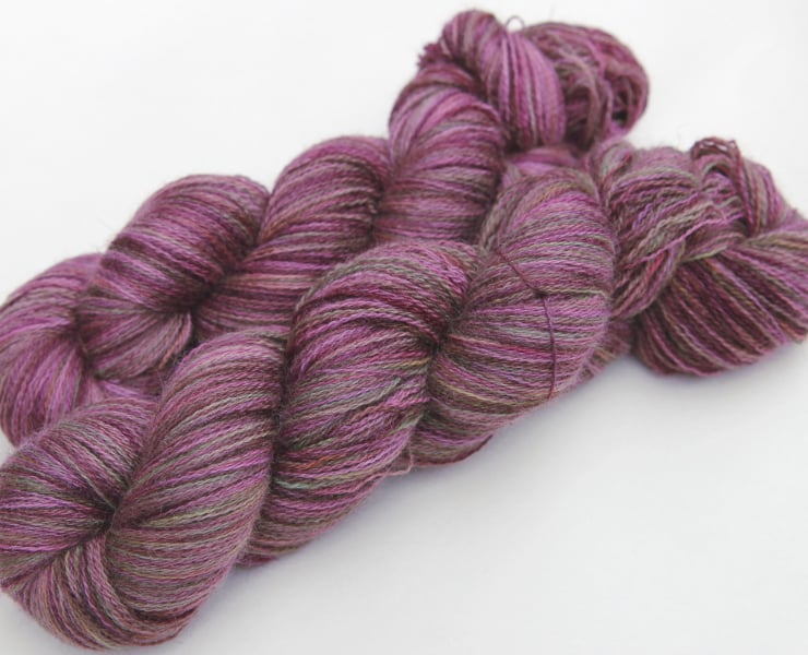 Heathery purples from aubergine to mauve with muted greens and browns. This lustrous, lofty and slightly fuzzy yarn should make beautiful lace projects. These skeins have been dyed together but have slight differences in colour proportions and blending, so if you plan to use both skeins in the same project, alternating skeins as you work is recommended. There are two skeins available (price shown is for one). (Photographs have been taken and edited in bright natural light.)