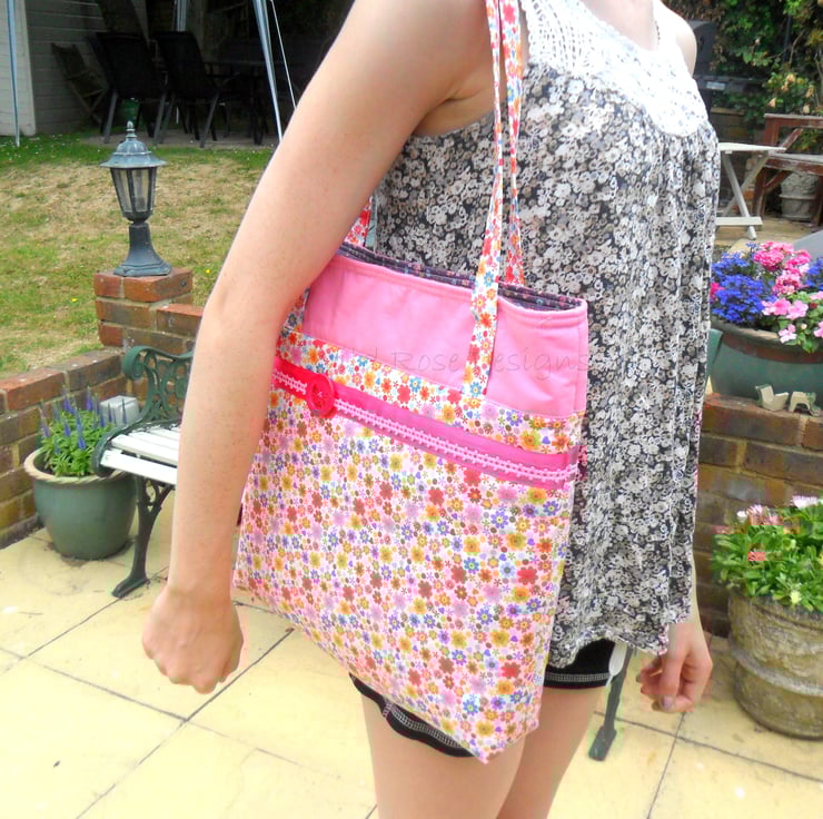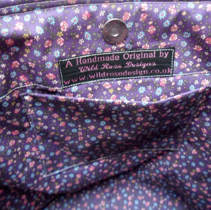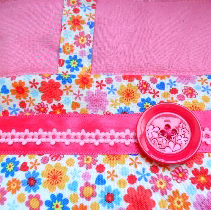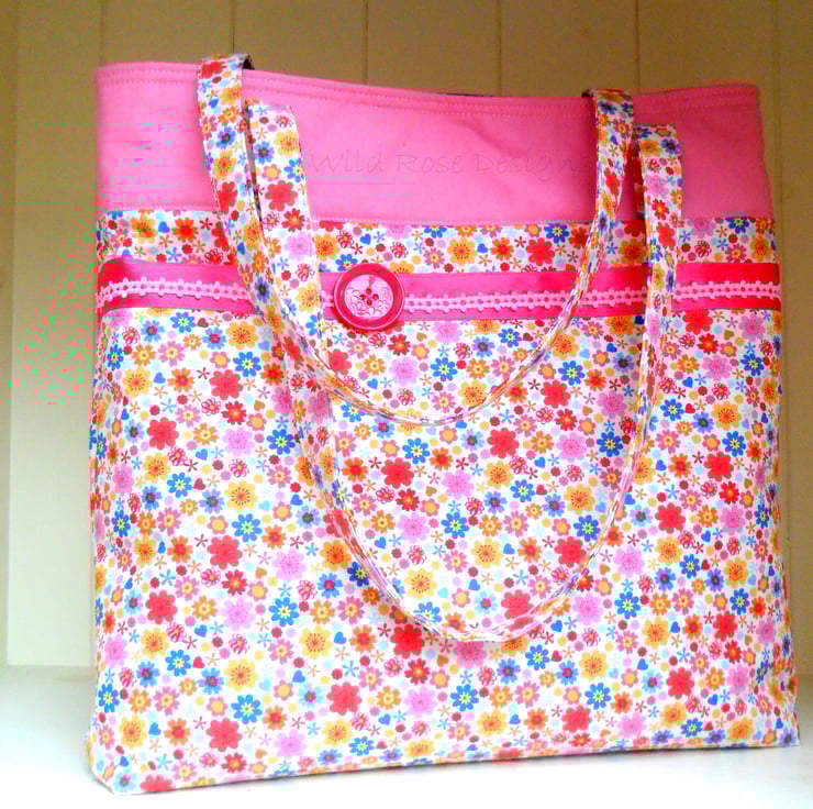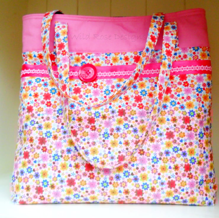 A bright and summery handmade bag perfect for carrying around all those summer essentials. It is made from a floral print cotton with a plain pink band at the top, and trimmed with pink ribbon and a cerise button. The handles, which are just long enough to go over your shoulder are made in the floral print. The lining is a purple mix cotton print and it has a slip pocket for your phone. The bag which measures 32 cm x 32 cm x 6 cm (12 3/4" x 12 3/4" x 2 1/2") fastens with a magnetic snap.