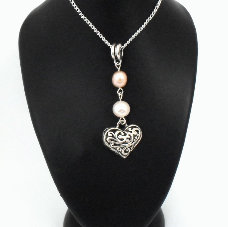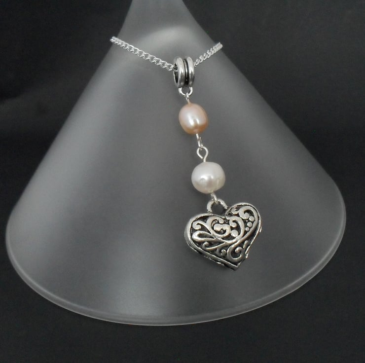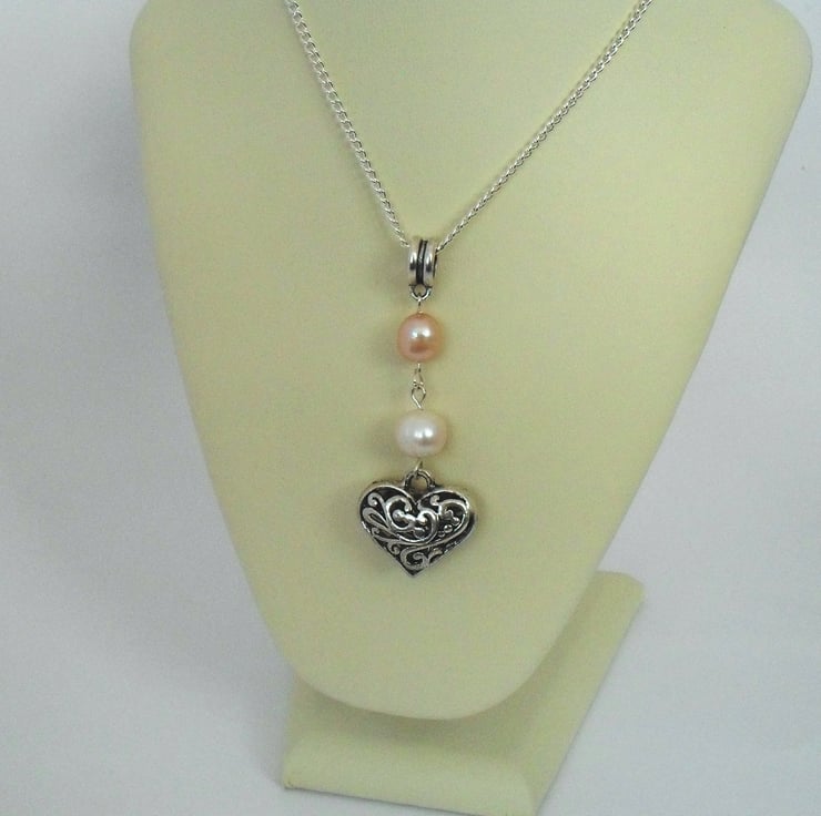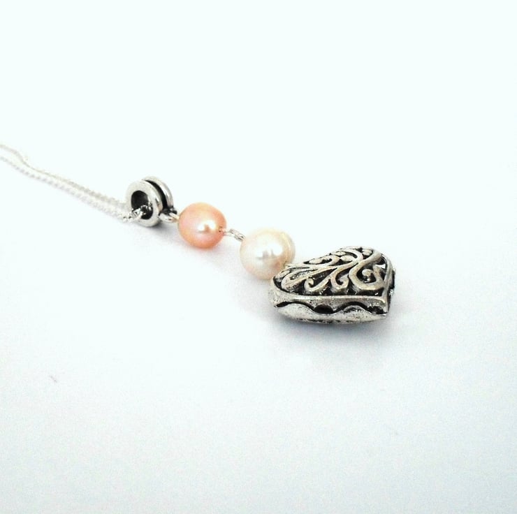A duet of pearls - one a delicate peach pearl that is approximately 7 mm, the other a slightly larger ivory pearl, look stunning with this chunky tibetan silver heart charm.