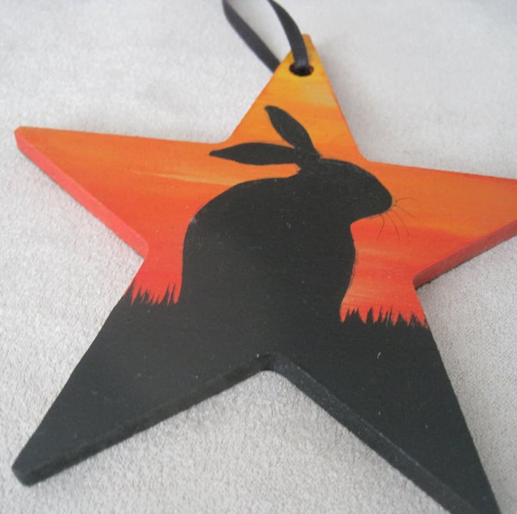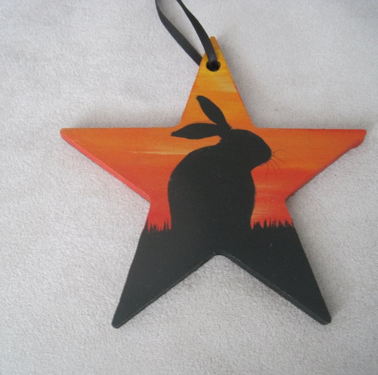 A wooden star hand painted with a rabbit silhouetted against a sky in shades of orange, red and gold.