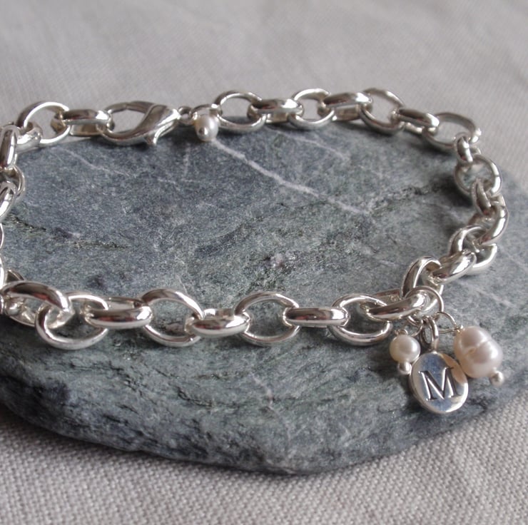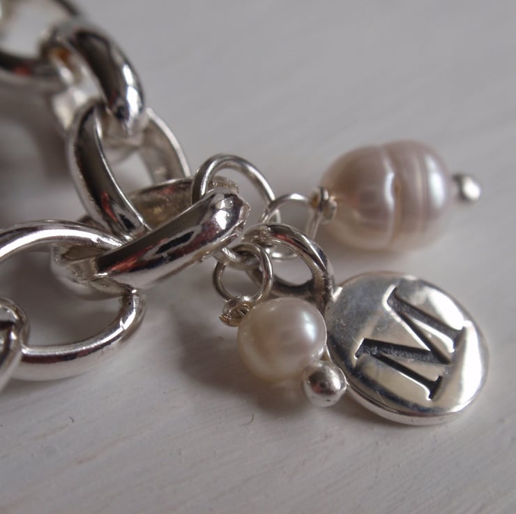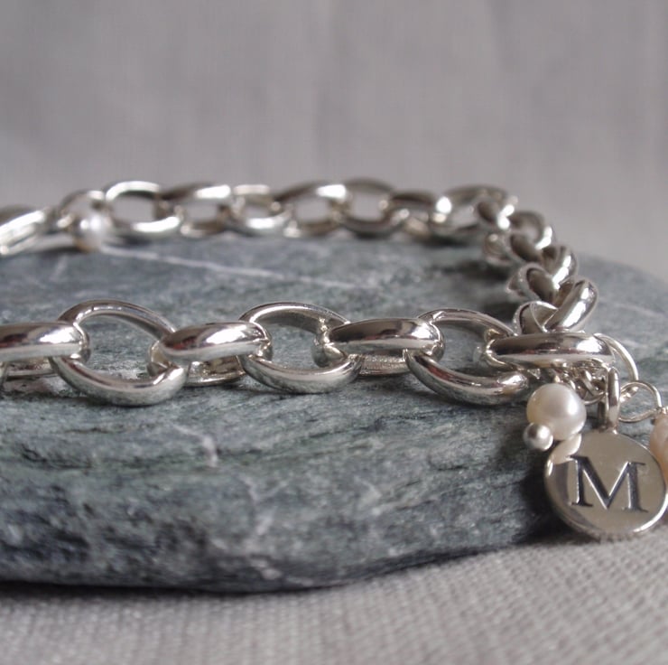 Silver plated chain bracelet with 3 clusters of initials and ivory freshwater pearls.