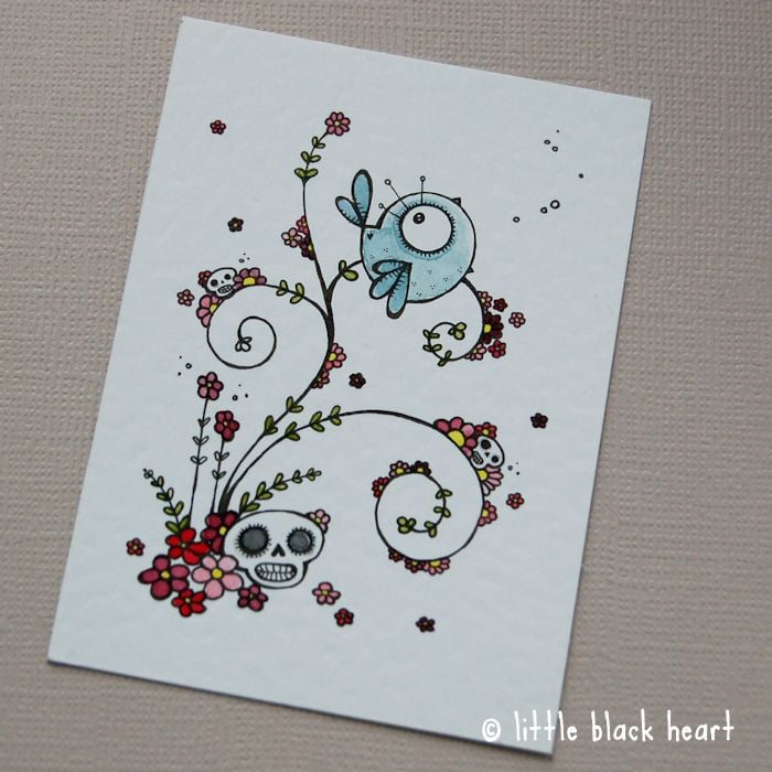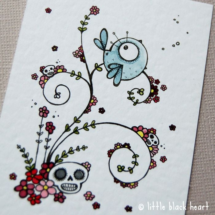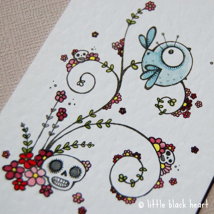 a sweet little blue bird surrounded by gorgeous swirly summer blossom and a little grinning skull (or 3!) for good measure.