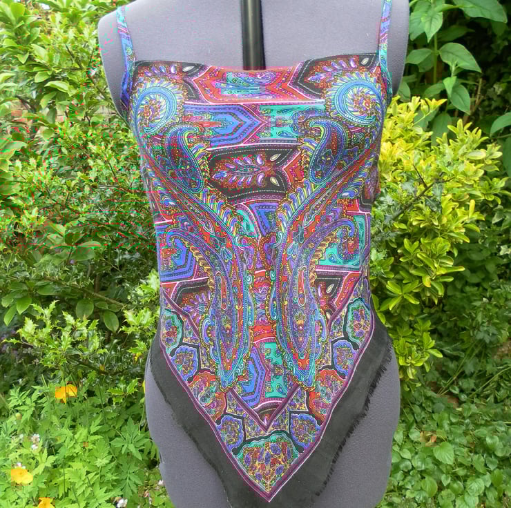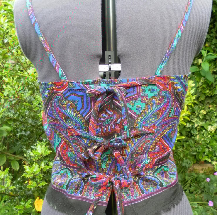 This elegant blouse is handmade by me, from a section of large vintage scarf. It is a one off and would be exclusive to you, perfect for a party. The fabric has a black background with an elaborate and vibrant multi-coloured pattern. It has spaghetti straps and three bow ties on the back. I have designed it so that one size fits all. In the first two photographs the mannequin is set at 37 inches/ 94 cm at the bust, and 29 inches/ 73cm at the waist. In the other photographs the mannequin is set at 33.5inches/85cm at the bust and 24 inches/62cm at the waist. Adjustments can be made using the ties at the back.