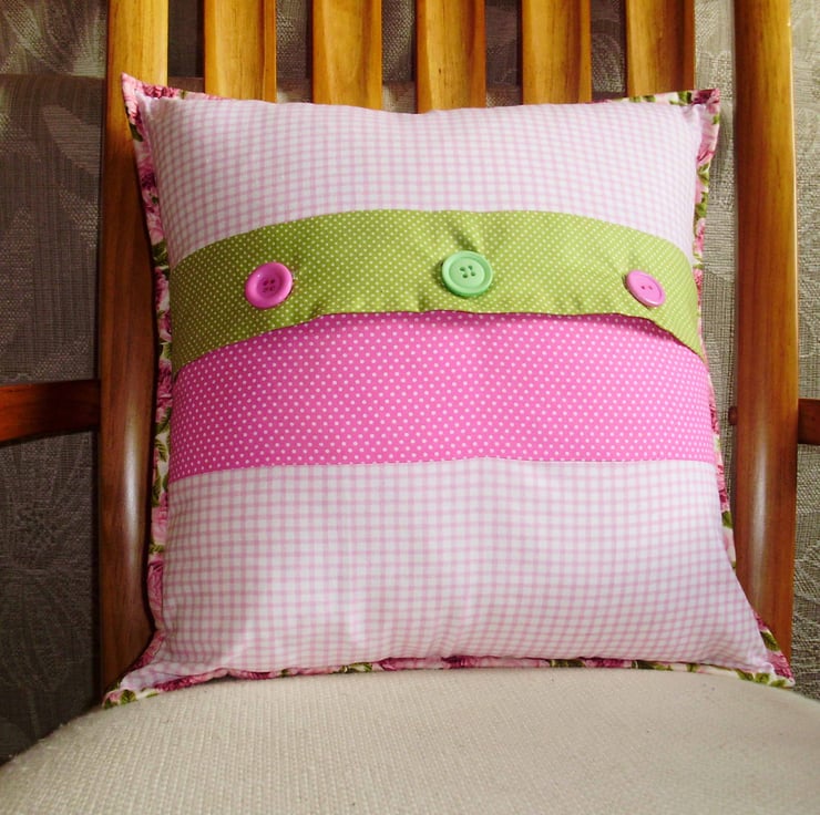 15inch (38cm) square patchwork cushion made from a selection of floral and spot (or dot) fabrics. This has been quilted to enhance the effect. This would make a lovely present , and it would be very pretty in the bedroom.