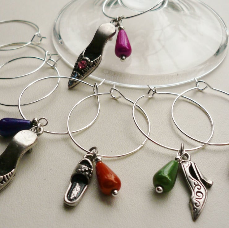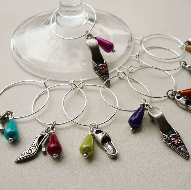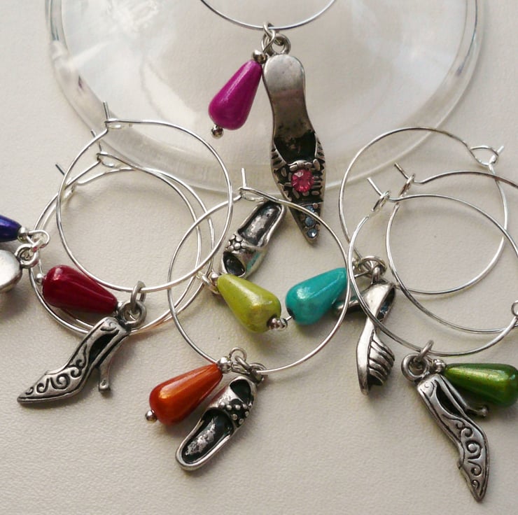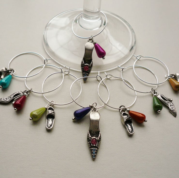 This set of 8 wine glass charms consists of antique silver shoe charms - two each of four defferent designs - teamed with different coloured 10mm pearl drop miracle beads.