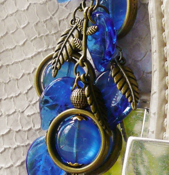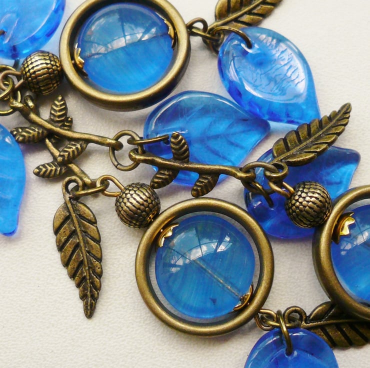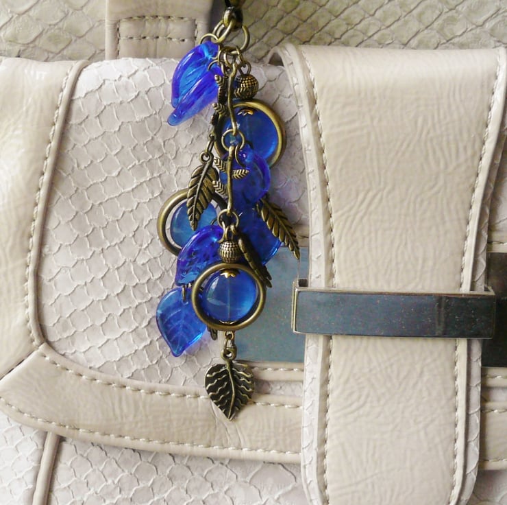 This handbag charm consists of 18mm long blue glass leaves with 15mm round blue czech glass flat beads set inside antique bronze round bead frames. Connectors, beads and leaf charms are also antique bronze as is the 30mm trigger clasp. Total length incl clasp is approx 13cm.