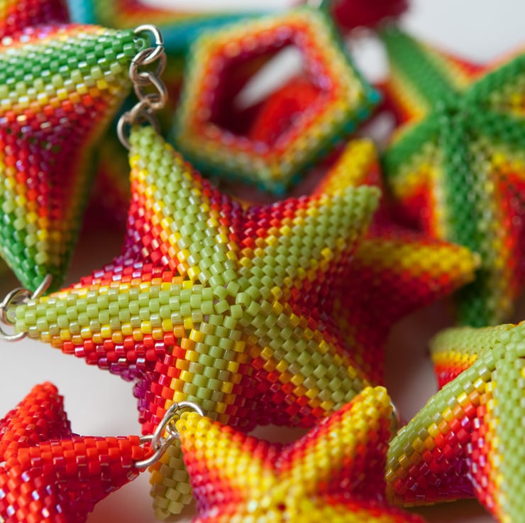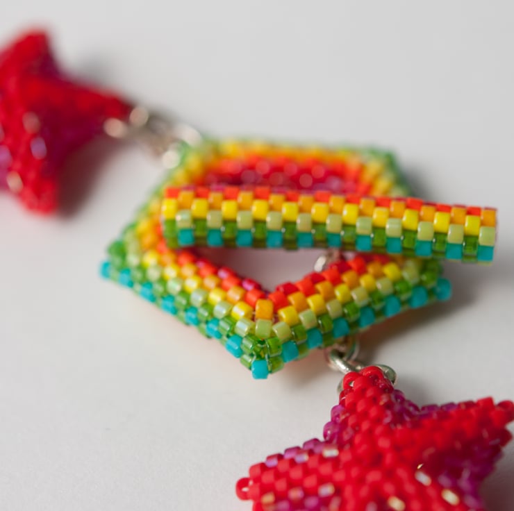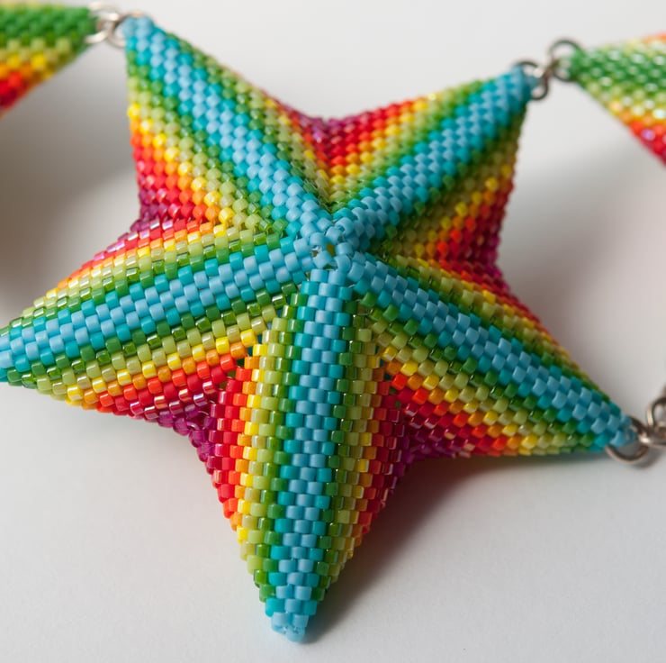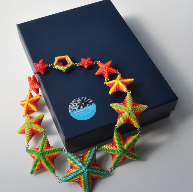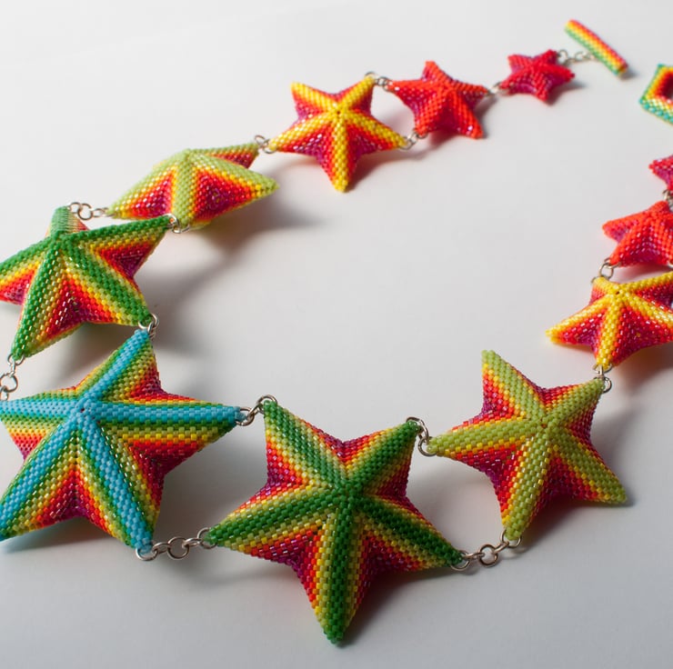 This is one of the biggest pieces I've ever made, and took me over 6 months to complete. Each tiny bead is hand stitched using peyote stitch with others to form a distorted square, and then five squares are joined to make each of the fat stars. There are 11 stars in total, ranging from 2.5cm to 7cm in size. The stars are joined using sterling silver jump rings, and the piece is completed with a hand beaded hollow pentagon clasp and toggle. The finished piece measures 53cm when clasped, a kind of mid length necklace.