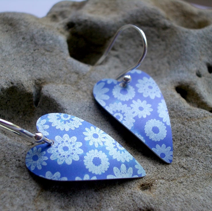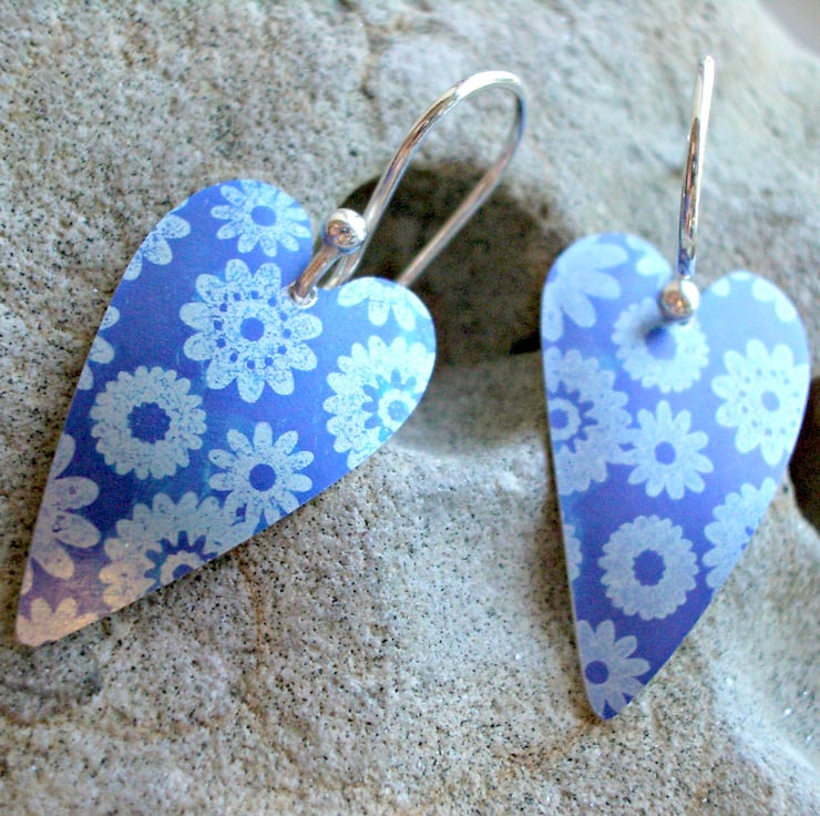 These sweet little blue coloured heart earrings are hand made from aluminium which I have dyed in a lovely blue colour adding silver flower prints. I then seal the dye so that it becomes a permanent part of the metal. I cut out the heart shapes by hand, using a piercing saw, then dome them so that they catch the light.