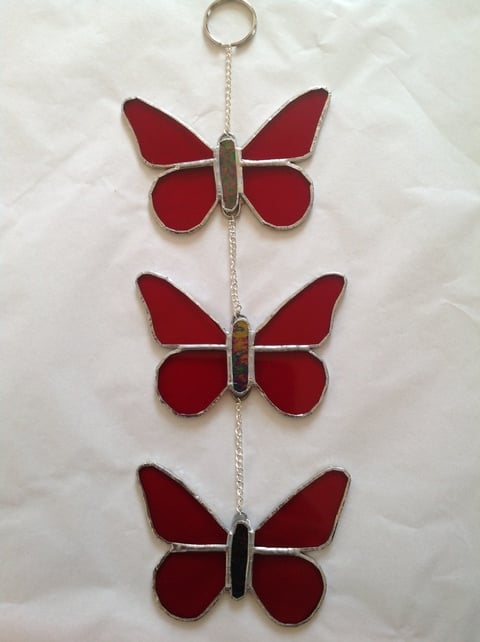 This is a three red butterfly sun catcher which I have made using the copper foiling technique.