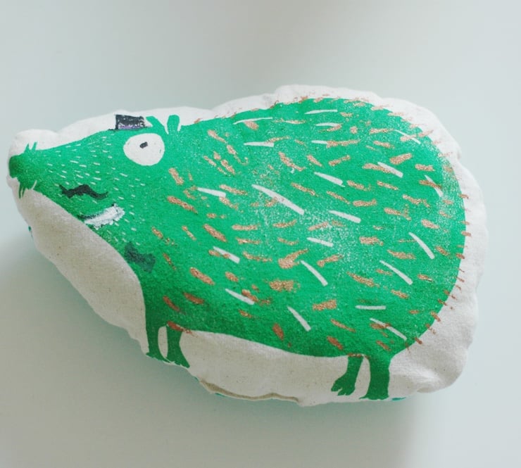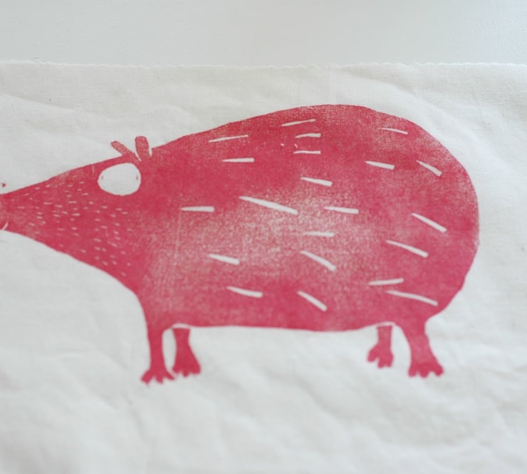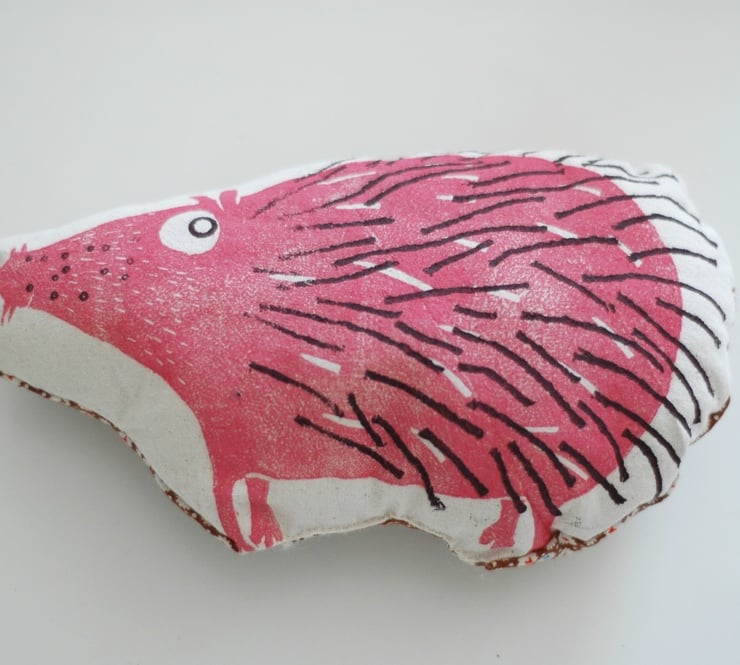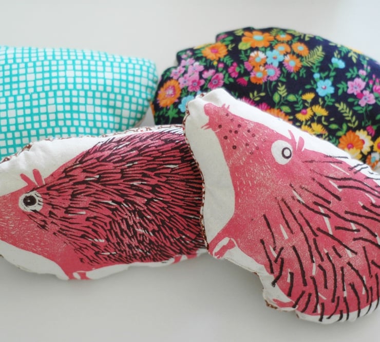 The hedgehog print is 20cm long and 14 cm high and printed by hand from my original lino block in pink (or blue/green/peach etc) on unbleached cotton. It is printed with fabric block printing ink and can be washed gently and at a cool temperature, preferably by hand.