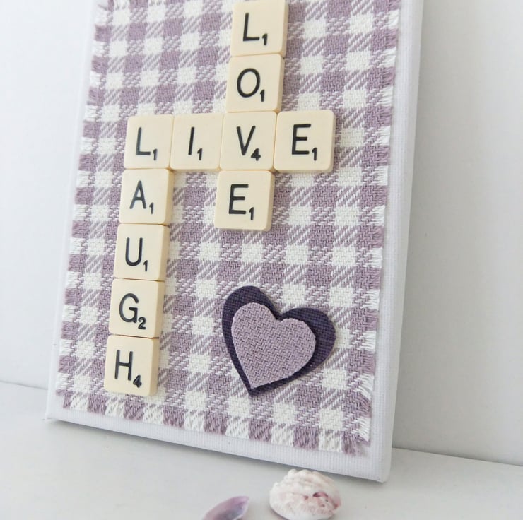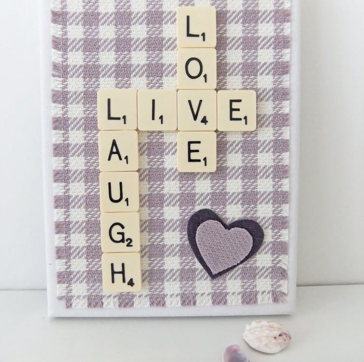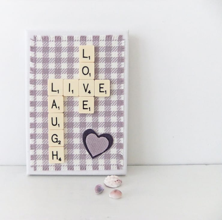 Upcycled Scrabble letters and rescued fabric have been used to create this sweet little “LIVE LAUGH LOVE ” picture. This lovely little sign is on a slim canvas block and is designed to lean gently on the wall!