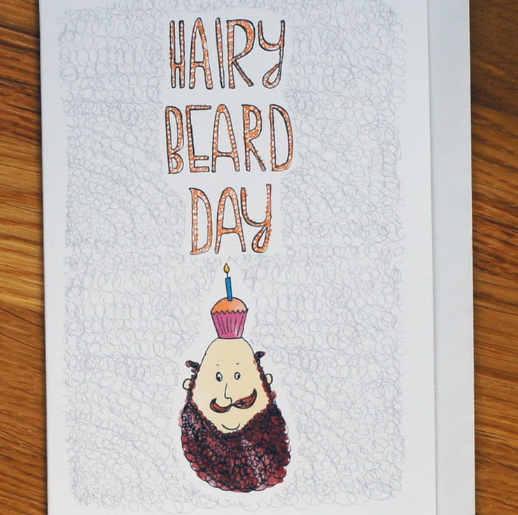 hairy beard day! this card is for birthdays or for anyone who has a fondness of beards. for some reason he has a cake on his head.