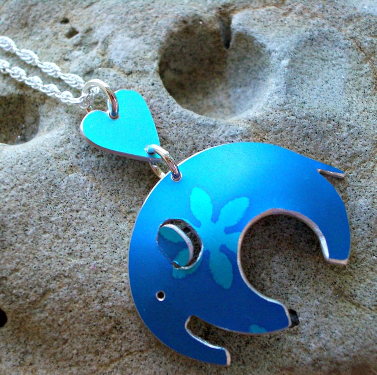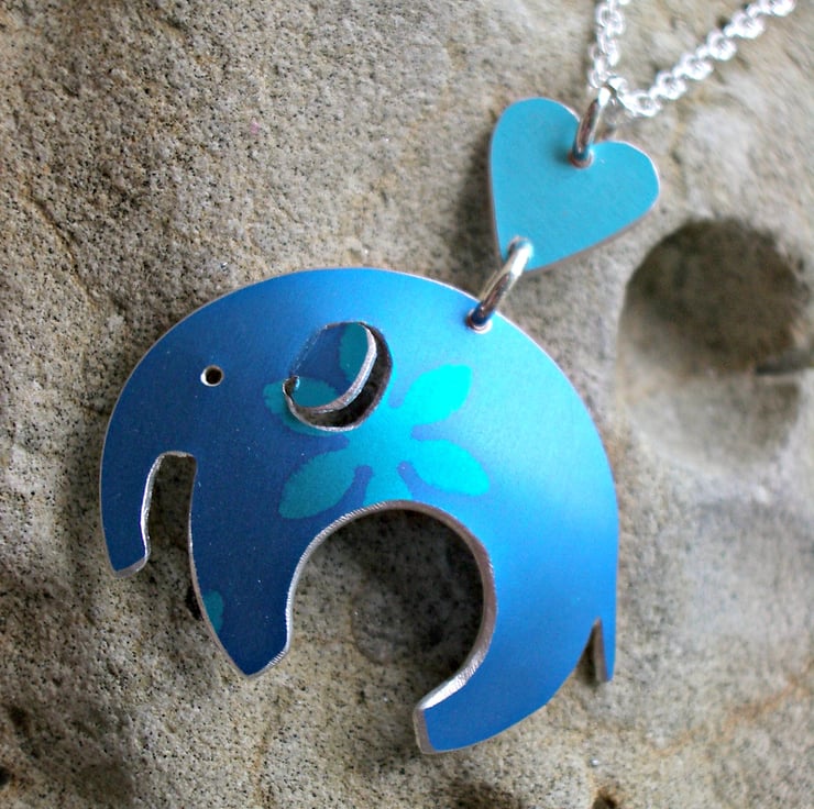 This sweet little elephant pendant is made from aluminium which I have dyed, printed and sealed so that the colour becomes a permanent part of the metal. I cut out the shapes by hand using a piercing saw and file the edges so that it catches the light. The elephant is slightly domed and hangs from a small blue aluminium heart. The jumprings and chain (16") are all sterling silver. If you like this design but would prefer a different pattern or colour, please let me know and I'll see what I can do for you.