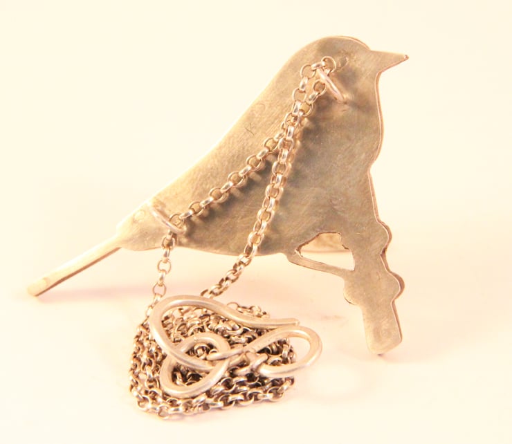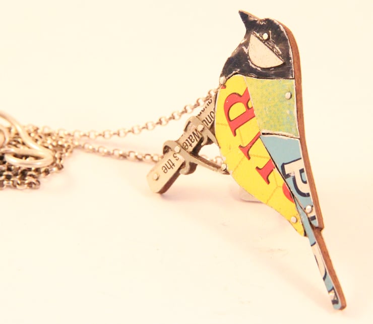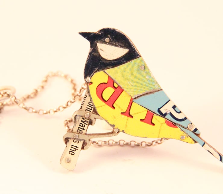This Necklace is made by collaging old tins that I collect. Which means that each one is individual. I have a large collection of tins and sift through them all to find the right colours. I try and pick colours as close as possible to the bird. In this case a Great Tit, which is a combination of yellows, green and bluey/black. Each piece is cut out with my piercing saw and filed so it fits properly.