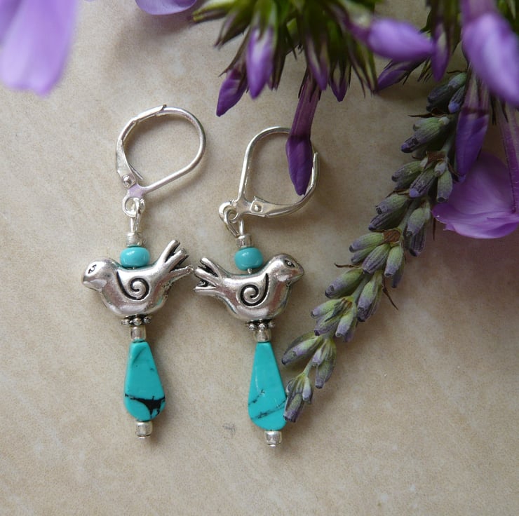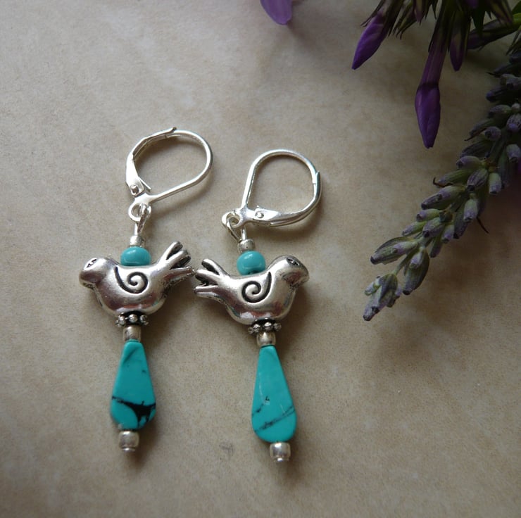 Tibetan style bird beads are the main feature with aqua coloured beads for accent and to provide a stunning pair of earrings. Very different and unique.